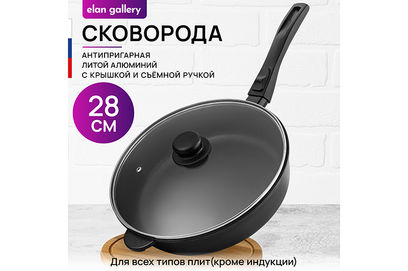 Глубокая сковорода Elan Gallery "Чёрный оникс" с крышкой и съёмной ручкой из серии "Гармония вкуса" диаметром 28 см равномерно разогревается и распределяет тепло, поэтому продукты в ней сохраняют полезные свойства и сочность. Диаметр дна — 22 см. Стильный дизайн подойдет к любому интерьеру кухни. Подходит для приготовления стейков из рыбы, мяса или блюд из овощей. Сковорода с глубоким дном выполнена из толстостенного литого алюминия и имеет ультрапрочное двухслойное антипригарное покрытие Cookmark. Оно устойчиво к царапинам и износу, безопасно для здоровья и не содержит PFOA или других вредных веществ. Используйте для жарки котлет или картофеля с минимальным количеством масла. Здоровую пищу оценит любой гурман! Готовьте на завтрак оладьи или блюда из яиц: яичницу, омлет. Порадуйте близких большой порцией блинов на Масленицу, ни один блинчик не подгорит. Алюминиевая сковородка с толстым дном имеет удобную ручку, которая обеспечивает надежный захват при подаче еды с плиты на стол. Без крышки и ручки можно использовать в духовом шкафу как форму для запекания при температуре до 250°C. Не использовать съёмную ручку, чтобы достать раскалённую сковороду из духовой печи! Приготовьте румяную курочку в духовке и порадуйте своих близких. Эксплуатация: не нагревать без продуктов. Дайте посуде остыть, прежде чем помещать ее в воду. Использовать только деревянные, силиконовые и пластиковые лопатки без острых краёв. Не мыть абразивными или щелочными моющими средствами. Использовать в ПММ в режиме "Эко" со средством, не содержащим щёлочи. Подходит для стеклокерамических, газовых и электрических плит. Не подходит для индукционных плит. Кухонная утварь станет приятным подарком для женщин на День Рождения, 8 Марта и придаст процессу приготовления пищи комфорта. Подарите универсальную вещь маме, подруге, сестре или бабушке. Хорошая сковорода – мечта любой хозяйки! Сковородка станет незаменимым инвентарем на вашей кухне и наполнит процесс приготовления пищи удовольствием!