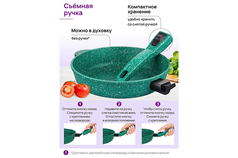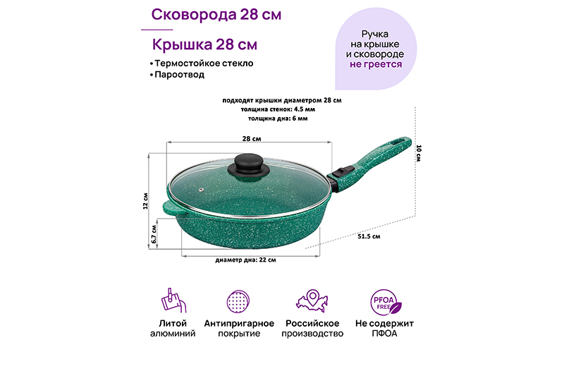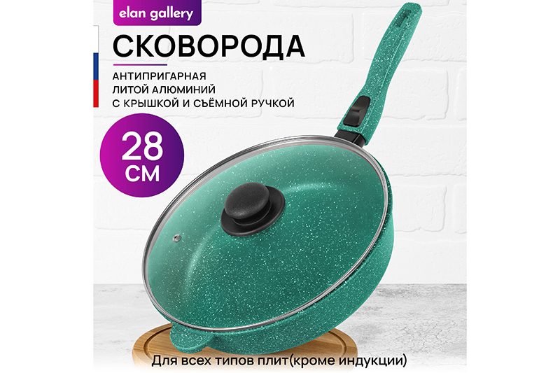 Глубокая сковорода Elan Gallery "Изумруд" с крышкой и съёмной ручкой из серии "Гармония вкуса" диаметром 28 см равномерно разогревается и распределяет тепло, поэтому продукты в ней сохраняют полезные свойства и сочность. Диаметр дна — 22 см. Стильный дизайн подойдет к любому интерьеру кухни. Подходит для приготовления стейков из рыбы, мяса или блюд из овощей. Сковорода с глубоким дном выполнена из толстостенного литого алюминия и имеет ультрапрочное двухслойное антипригарное покрытие Cookmark. Оно устойчиво к царапинам и износу, безопасно для здоровья и не содержит PFOA или других вредных веществ. Используйте для жарки котлет или картофеля с минимальным количеством масла. Здоровую пищу оценит любой гурман! Готовьте на завтрак оладьи или блюда из яиц: яичницу, омлет. Порадуйте близких большой порцией блинов на Масленицу, ни один блинчик не подгорит. Алюминиевая сковородка с толстым дном имеет удобную ручку, которая обеспечивает надежный захват при подаче еды с плиты на стол. Без крышки и ручки можно использовать в духовом шкафу как форму для запекания при температуре до 250°C. Не использовать съёмную ручку, чтобы достать раскалённую сковороду из духовой печи! Приготовьте румяную курочку в духовке и порадуйте своих близких. Эксплуатация: не нагревать без продуктов. Дайте посуде остыть, прежде чем помещать ее в воду. Использовать только деревянные, силиконовые и пластиковые лопатки без острых краёв. Не мыть абразивными или щелочными моющими средствами. Использовать в ПММ в режиме "Эко" со средством, не содержащим щёлочи. Подходит для стеклокерамических, газовых и электрических плит. Не подходит для индукционных плит. Кухонная утварь станет приятным подарком для женщин на День Рождения, 8 Марта и придаст процессу приготовления пищи новый уровень комфорта. Подарите универсальную вещь маме, подруге, сестре или бабушке. Хорошая сковорода – мечта любой хозяйки! Сковородка станет незаменимым инвентарем на вашей кухне и наполнит процесс приготовления пищи удовольствием!