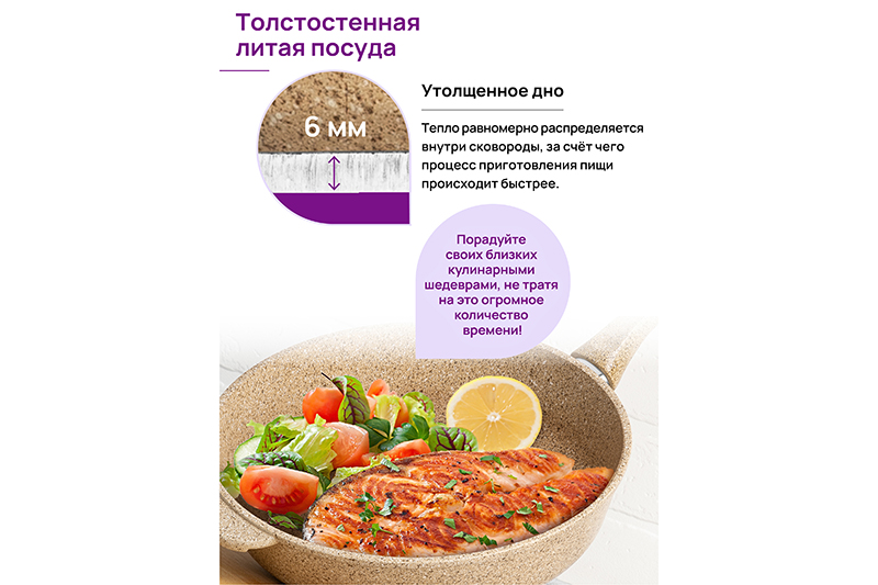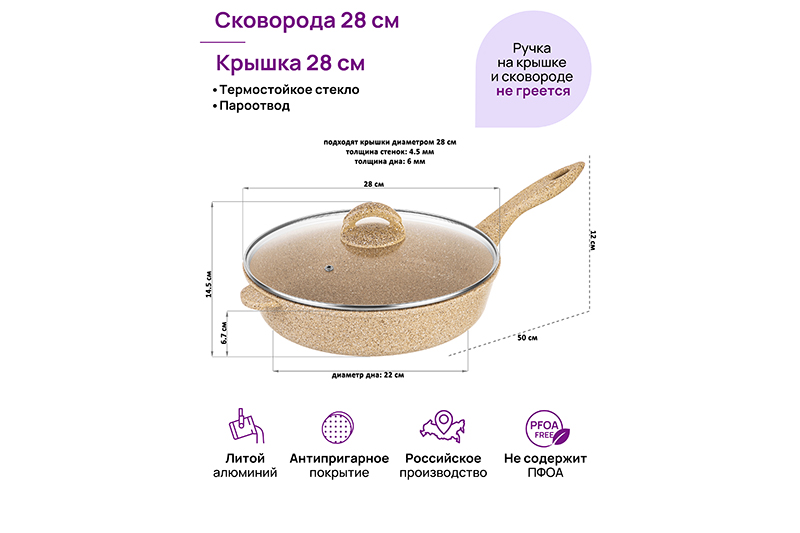 Глубокая сковорода Elan Gallery "Медовый гранит" с крышкой и несъёмной ручкой из серии "Гармония вкуса" диаметром 28 см равномерно разогревается и распределяет тепло, поэтому продукты в ней сохраняют полезные свойства и сочность. Диаметр дна — 22 см. Стильный дизайн подойдет к любому интерьеру кухни. Подходит для приготовления стейков из рыбы, мяса или блюд из овощей. Сковорода с глубоким дном выполнена из толстостенного литого алюминия и имеет ультрапрочное двухслойное антипригарное покрытие Cookmark. Оно устойчиво к царапинам и износу, безопасно для здоровья и не содержит PFOA или других вредных веществ. Используйте для жарки котлет или картофеля с минимальным количеством масла. Здоровую пищу оценит любой гурман! Готовьте на завтрак оладьи или блюда из яиц: яичницу, омлет. Порадуйте близких большой порцией блинов на Масленицу, ни один блинчик не подгорит. Алюминиевая сковородка с толстым дном имеет удобную ручку, которая обеспечивает надежный захват при подаче еды с плиты на стол. Эксплуатация: не нагревать без продуктов. Дайте посуде остыть, прежде чем помещать ее в воду. Использовать только деревянные, силиконовые и пластиковые лопатки без острых краёв. Не мыть абразивными или щелочными моющими средствами. Использовать в ПММ в режиме "Эко" со средством, не содержащим щёлочи. Подходит для стеклокерамических, газовых и электрических плит. Не подходит для индукционных плит. Кухонная утварь станет приятным подарком для женщин на День Рождения, 8 Марта и придаст процессу приготовления пищи новый уровень комфорта. Подарите универсальную вещь маме, подруге, сестре или бабушке. Хорошая сковорода – мечта любой хозяйки! Готовьте с радостью и любовью, создавая вкусные блюда для себя и своих гостей. Сковородка станет незаменимым инвентарем на вашей кухне и наполнит процесс приготовления пищи удовольствием!