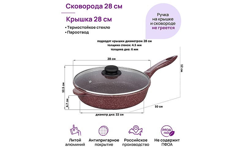 Глубокая сковорода Elan Gallery "Рубин" с крышкой и несъёмной ручкой из серии "Гармония вкуса" диаметром 28 см равномерно разогревается и распределяет тепло, поэтому продукты в ней сохраняют полезные свойства и сочность. Диаметр дна — 22 см. Стильный дизайн подойдет к любому интерьеру кухни. Подходит для приготовления стейков из рыбы, мяса или блюд из овощей. Сковорода с глубоким дном выполнена из толстостенного литого алюминия и имеет ультрапрочное двухслойное антипригарное покрытие Cookmark. Оно устойчиво к царапинам и износу, безопасно для здоровья и не содержит PFOA или других вредных веществ. Используйте для жарки котлет или картофеля с минимальным количеством масла. Здоровую пищу оценит любой гурман! Готовьте на завтрак оладьи или блюда из яиц: яичницу, омлет. Порадуйте близких большой порцией блинов на Масленицу, ни один блинчик не подгорит. Алюминиевая сковородка с толстым дном имеет удобную ручку, которая обеспечивает надежный захват при подаче еды с плиты на стол. Эксплуатация: не нагревать без продуктов. Дайте посуде остыть, прежде чем помещать ее в воду. Использовать только деревянные, силиконовые и пластиковые лопатки без острых краёв. Не мыть абразивными или щелочными моющими средствами. Использовать в ПММ в режиме "Эко" со средством, не содержащим щёлочи. Подходит для стеклокерамических, газовых и электрических плит. Не подходит для индукционных плит. Кухонная утварь станет приятным подарком для женщин на День Рождения, 8 Марта и придаст процессу приготовления пищи новый уровень комфорта. Подарите универсальную вещь маме, подруге, сестре или бабушке. Хорошая сковорода – мечта любой хозяйки! Готовьте с радостью и любовью, создавая вкусные блюда для себя и своих гостей. Сковородка станет незаменимым инвентарем на вашей кухне и наполнит процесс приготовления пищи удовольствием!
