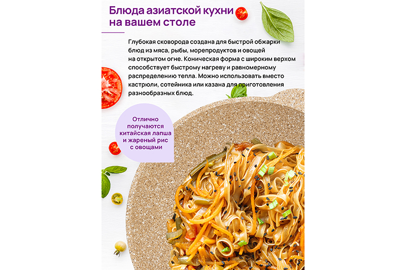 Сковорода-вок Elan Gallery "Медовый гранит" из серии "Гармония вкуса" объемом 3 литра с крышкой равномерно разогревается и распределяет тепло таким образом, что продукты в ней остаются сочными и сохраняют все свои полезные и вкусовые свойства. Диаметр крышки – 28 см, диаметр дна – 13 см, высота стенки внутри жаровни – 7,7 см. Сковорода выполнена из толстостенного литого алюминия и имеет ультрапрочное двухслойное антипригарное покрытие Cookmark. Покрытие устойчиво к царапинам и износу, полностью безопасно для здоровья и не содержит PFOA или других вредных веществ. Вок идеально подойдёт для приготовления азиатских блюд из лапши, мяса, овощей или риса. Можно использовать вместо казана, сотейника или кастрюли для приготовления любой еды. Эксплуатация: не нагревать без продуктов. Дайте посуде остыть, прежде чем помещать ее в воду. Использовать только деревянные и силиконовые приборы. Не мыть абразивными или щелочными моющими средствами. Использовать в посудомоечной машине только в режиме "Эко" с применением средств, не содержащих щелочи. Подходит для всех типов плит, кроме индукционных. Можно использовать в духовом шкафу без крышки при температуре до 250 градусов. Сковорода станет идеальным подарком для женщин и придаст процессу приготовления пищи новый уровень комфорта. Подарите такую универсальную вещь маме, подруге, сестре или тёте. Хорошая сковородка – мечта любой хозяйки! В серии "Гармония вкуса" вы найдёте любой кухонный инвентарь для вашего дома: сковороды, кастрюли, блинницы, казаны и жаровни. Соберите набор посуды для вашей кухни в едином стиле!