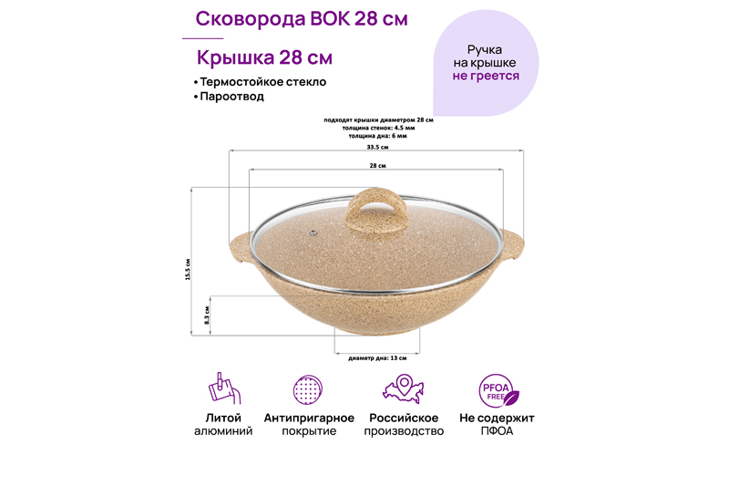 Сковорода ВОК 28 см 3 л ГАРМОНИЯ ВКУСА "Медовый гранит" С КРЫШКОЙ ф28, 33,5*29,5*15,5 см