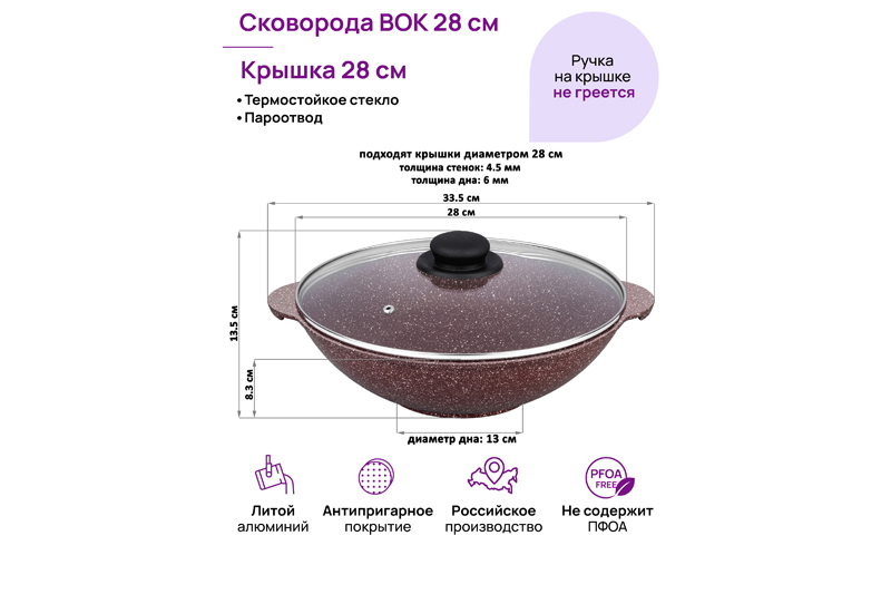 Сковорода ВОК 28 см 3 л ГАРМОНИЯ ВКУСА "Рубин" С КРЫШКОЙ ф28, 33,5*29,5*13,5 см