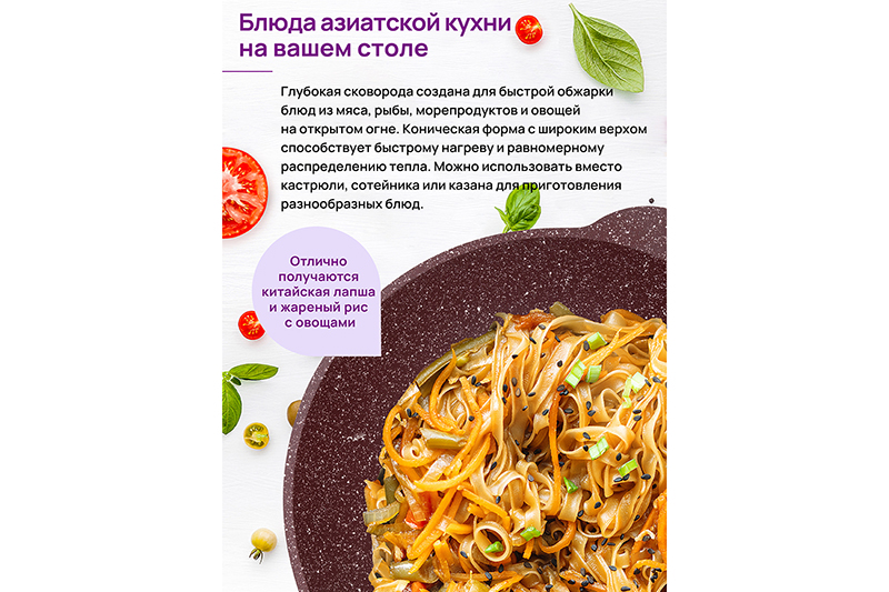 Сковорода-вок "Гармония вкуса" объемом 3 литра с крышкой равномерно разогревается и распределяет тепло таким образом, что продукты в ней остаются сочными и сохраняют все свои полезные и вкусовые свойства. Сковорода выполнена из толстостенного литого алюминия и имеет ультрапрочное двухслойное антипригарное покрытие Cookmark. Покрытие устойчиво к царапинам и износу, полностью безопасно для здоровья и не содержит PFOA или других вредных веществ. Эксплуатация: не нагревать без продуктов. Дайте посуде остыть, прежде чем помещать ее в воду. Использовать только деревянные и силиконовые приборы. Не мыть абразивными или щелочными моющими средствами. Использовать в посудомоечной машине только в режиме "Эко". Подходит для всех типов плит, кроме индукционных. Можно использовать в духовом шкафу без крышки при температуре до 250 градусов.