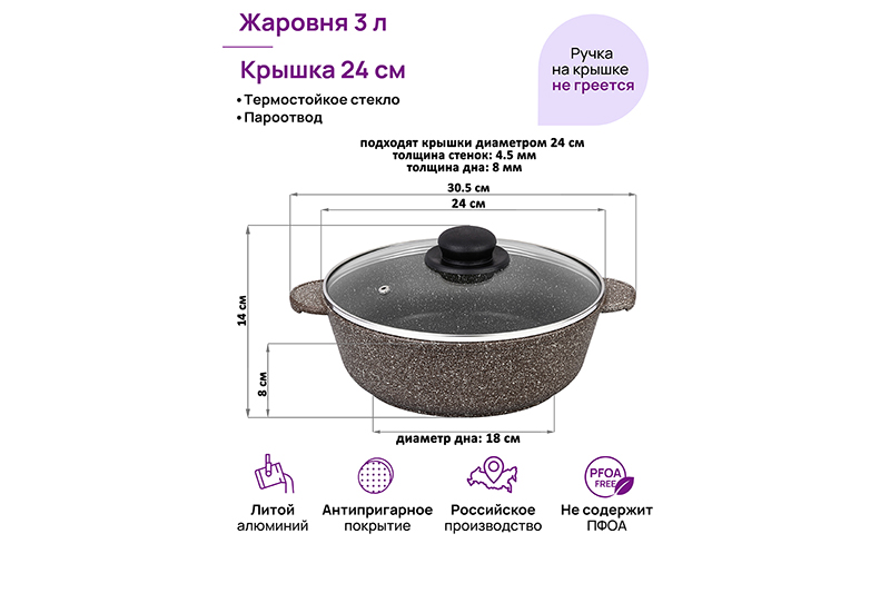 Жаровня «Коричневый опал» из серии «Гармония вкуса» предназначена для приготовления горячих блюд. Размер изделия – 30,5х25х14 см, объём – 3 литра. Высота без крышки – 8 см, высота внутренней части – 7,4 см, диаметр дна – 18 см. Сотейник изготовлен из толстостенного алюминия и имеет ультрапрочное двухслойное антипригарное покрытие Cookmark. Оно устойчиво к износу и царапинам, не содержит PFOA и других вредных веществ, что делает его полностью безопасным для здоровья. Толстые стенки и плотно прилегающая крышка из жаропрочного стекла создают при нагреве эффект духовки. Пароотвод обеспечивает равномерную циркуляцию. Жар распределяется по изделию таким образом, что продукты надолго сохраняют свои сочность, аромат и полезные свойства. Красивая алюминиевая жаровня – мечта любой хозяйки. С её помощью вы легко приготовите вкусную пищу дома и на даче. Используйте глубокий сотейник для приготовления мясных, рыбных и овощных блюд. Это универсальная кухонная утварь, подходящая для варки, жарки и тушения. Приготовьте в ней плов, бульон или самые разнообразные угощения из мяса, рыбы и овощей. Правила эксплуатации: не нагревайте без продуктов. Прежде, чем поместить в воду, дайте изделию остыть. Пользуйтесь только деревянными и силиконовыми приборами. Не мойте абразивными или щелочными моющими средствами. Использование в посудомоечной машине допускается только в режиме «Эко» с применением средств, не содержащих щёлочь. Подходит для газовых, электрических и стеклокерамических плит. Не подходит для индукции. Без крышки подходит для запекания в духовом шкафу при температуре до 230 градусов. Такая посуда станет прекрасным подарком маме или бабушке. В серии «Гармония вкуса» вы найдёте сковороды, кастрюли, блинницы, казаны и жаровни. Соберите набор для вашей кухни в едином стиле и дополните свой инвентарь!