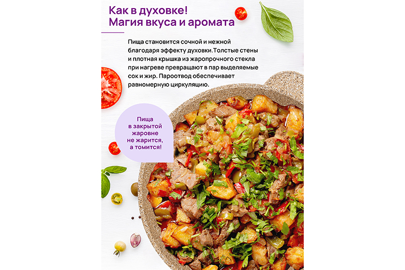 Жаровня «Медовый гранит» из серии «Гармония вкуса» предназначена для приготовления горячих блюд. Размер изделия – 32,5х27х16,5 см, объём – 3,7 литра. Высота без крышки – 9 см, высота внутренней части – 8,4 см, диаметр дна – 20 см. Сотейник изготовлен из толстостенного алюминия и имеет ультрапрочное двухслойное антипригарное покрытие Cookmark. Оно устойчиво к износу и царапинам, не содержит PFOA и других вредных веществ, что делает его полностью безопасным для здоровья. Толстые стенки и плотно прилегающая крышка из жаропрочного стекла создают при нагреве эффект духовки. Пароотвод обеспечивает равномерную циркуляцию. Жар распределяется по изделию таким образом, что продукты надолго сохраняют свои сочность, аромат и полезные свойства. Красивая алюминиевая жаровня – мечта любой хозяйки. С её помощью вы легко приготовите вкусную пищу дома и на даче. Используйте глубокий сотейник для приготовления мясных, рыбных и овощных блюд. Это универсальная кухонная утварь, подходящая для варки, жарки и тушения. Приготовьте в ней плов, бульон или самые разнообразные угощения из мяса, рыбы и овощей. Правила эксплуатации: не нагревайте без продуктов. Прежде, чем поместить в воду, дайте изделию остыть. Пользуйтесь только деревянными и силиконовыми приборами. Не мойте абразивными или щелочными моющими средствами. Использование в посудомоечной машине допускается только в режиме «Эко» с применением средств, не содержащих щёлочь. Подходит для газовых, электрических и стеклокерамических плит. Не подходит для индукции. Без крышки подходит для запекания в духовом шкафу при температуре до 230 градусов. Такая посуда станет прекрасным подарком маме или бабушке. В серии «Гармония вкуса» вы найдёте сковороды, кастрюли, блинницы, казаны и жаровни. Соберите набор для вашей кухни в едином стиле и дополните свой инвентарь!