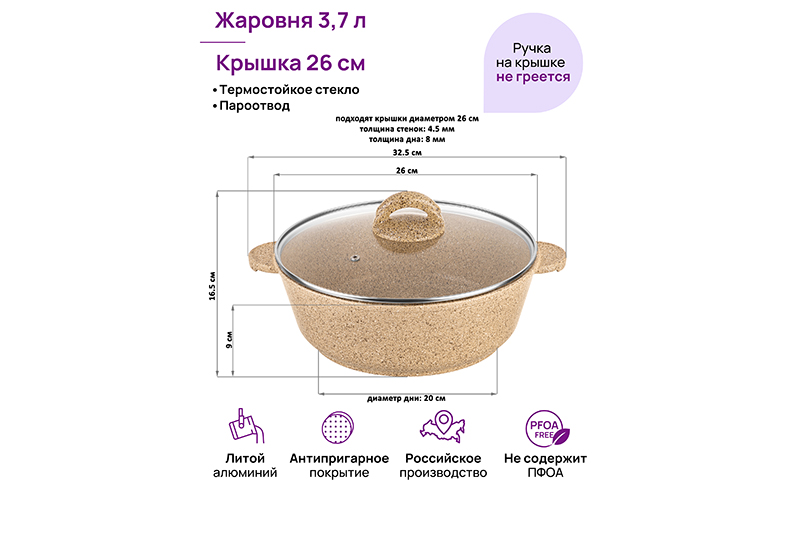 Жаровня (сотейник) 26 см 3,7 л ГАРМОНИЯ ВКУСА "Медовый гранит" С КРЫШКОЙ ф26, 32,5*27*16,5 см