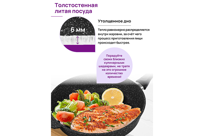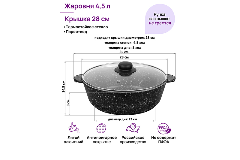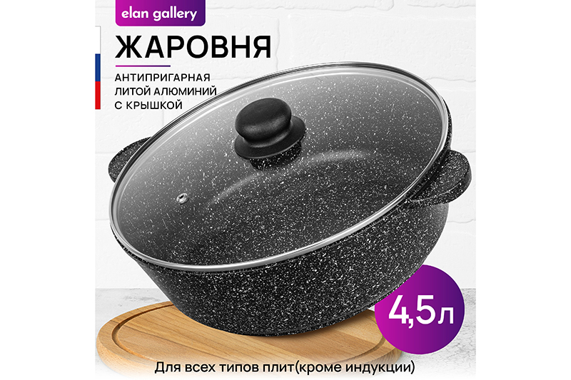 Жаровня (сотейник) 28 см 4,5 л ГАРМОНИЯ ВКУСА "Черный мрамор" С КРЫШКОЙ ф28, 35*29*14,5 см