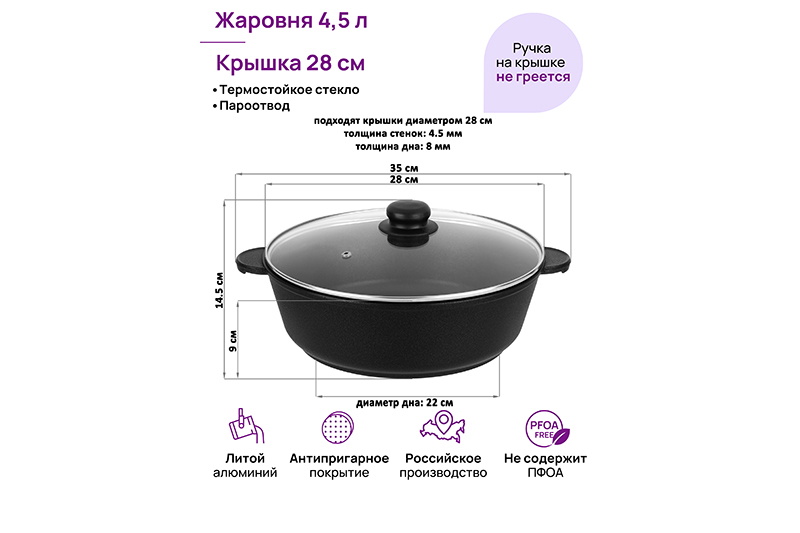Жаровня «Чёрный Оникс» из серии «Гармония вкуса» предназначена для приготовления горячих блюд. Размер изделия – 35х29х14,5 см, объём – 4,5 литра. Высота без крышки – 9 см, высота внутренней части – 8,4 см, диаметр дна – 22 см. Сотейник изготовлен из толстостенного алюминия и имеет ультрапрочное двухслойное антипригарное покрытие Cookmark. Оно устойчиво к износу и царапинам, не содержит PFOA и других вредных веществ, что делает его полностью безопасным для здоровья. Толстые стенки и плотно прилегающая крышка из жаропрочного стекла создают при нагреве эффект духовки. Пароотвод обеспечивает равномерную циркуляцию. Жар распределяется по изделию таким образом, что продукты надолго сохраняют свои сочность, аромат и полезные свойства. Красивая алюминиевая жаровня – мечта любой хозяйки. С её помощью вы легко приготовите вкусную пищу дома и на даче. Используйте глубокий сотейник для приготовления мясных, рыбных и овощных блюд. Это универсальная кухонная утварь, подходящая для варки, жарки и тушения. Приготовьте в ней плов, бульон или самые разнообразные угощения из мяса, рыбы и овощей. Правила эксплуатации: не нагревайте без продуктов. Прежде, чем поместить в воду, дайте изделию остыть. Пользуйтесь только деревянными и силиконовыми приборами. Не мойте абразивными или щелочными моющими средствами. Использование в посудомоечной машине допускается только в режиме «Эко» с применением средств, не содержащих щёлочь. Подходит для газовых, электрических и стеклокерамических плит. Не подходит для индукции. Без крышки подходит для запекания в духовом шкафу при температуре до 230 градусов. Такая посуда станет прекрасным подарком маме или бабушке. В серии «Гармония вкуса» вы найдёте сковороды, кастрюли, блинницы, казаны и жаровни. Соберите набор для вашей кухни в едином стиле и дополните свой инвентарь!