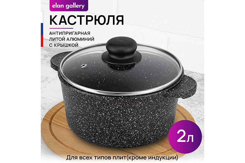 Кастрюля Elan Gallery "Чёрный мрамор" из серии "Гармония вкуса" объёмом 2 литра с крышкой равномерно разогревается и распределяет тепло таким образом, что продукты в ней остаются сочными и сохраняют все полезные свойства и аромат. Диаметр стеклянной крышки – 18 см, диаметр дна – 17 см. Кастрюля с прозрачной крышкой выполнена из толстостенного литого алюминия и имеет ультрапрочное двухслойное антипригарное покрытие Cookmark. Покрытие устойчиво к царапинам и износу, полностью безопасно для здоровья и не содержит PFOA или других вредных веществ. Крышка изготовлена из жаропрочного стекла и имеет пароотвод. Алюминиевая кастрюлька с толстыми дном и стенками выполнена в стильном дизайне и позволит приготовить дома суп, кашу, плов или любой гарнир. Порадуйте близких супом с фрикадельками, борщом или куриной лапшой. Удобна для приготовления пасты, так как макаронные изделия не будут прилипать на дно благодаря антипригарной поверхности. Суповая кастрюля подойдёт для тушения и варки блюд из мяса, рыбы и овощей. Эксплуатация: кухонную утварь не нагревать без продуктов. Дайте посуде остыть, прежде чем помещать ее в воду. Использовать только деревянные и силиконовые приборы. Не мыть абразивными или щелочными моющими средствами. Использовать в ПММ только в режиме "Эко" с применением средств, не содержащих щелочи. Подходит для стеклокерамических, газовых и электрических плит. Не подходит для индукционных плит! Без крышки можно использовать в духовой печи при температуре до 250 градусов. Теперь для использования в духовке не понадобится отдельная ёмкость. Кастрюля станет идеальным подарком для женщин на 8 Марта или День Рождения и придаст процессу приготовления пищи новый уровень комфорта. Подарите такую универсальную вещь маме, подруге, сестре или бабушке. Красивая кастрюля – мечта любой хозяйки! В серии "Гармония вкуса" вы найдёте любой кухонный инвентарь: сковороды, кастрюли, блинницы, казаны и жаровни. Соберите набор для вашей кухни или столовой в едином стиле! /