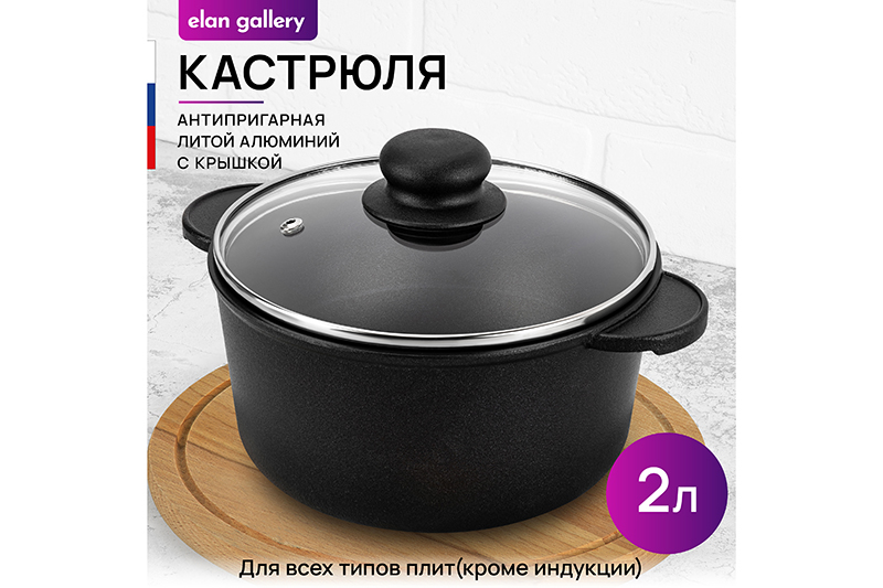 Кастрюля Elan Gallery "Чёрный оникс" из серии "Гармония вкуса" объёмом 2 литра с крышкой равномерно разогревается и распределяет тепло таким образом, что продукты в ней остаются сочными и сохраняют все полезные свойства и аромат. Диаметр стеклянной крышки – 18 см, диаметр дна – 17 см. Кастрюля с прозрачной крышкой выполнена из толстостенного литого алюминия и имеет ультрапрочное двухслойное антипригарное покрытие Cookmark. Покрытие устойчиво к царапинам и износу, полностью безопасно для здоровья и не содержит PFOA или других вредных веществ. Крышка изготовлена из жаропрочного стекла и имеет пароотвод. Алюминиевая кастрюлька с толстыми дном и стенками выполнена в стильном дизайне и позволит приготовить дома суп, кашу, плов или любой гарнир. Порадуйте близких супом с фрикадельками, борщом или куриной лапшой. Удобна для приготовления пасты, так как макаронные изделия не будут прилипать на дно благодаря антипригарной поверхности. Суповая кастрюля подойдёт для тушения и варки блюд из мяса, рыбы и овощей. Эксплуатация: кухонную утварь не нагревать без продуктов. Дайте посуде остыть, прежде чем помещать ее в воду. Использовать только деревянные и силиконовые приборы. Не мыть абразивными или щелочными моющими средствами. Использовать в ПММ только в режиме "Эко" с применением средств, не содержащих щелочи. Подходит для стеклокерамических, газовых и электрических плит. Не подходит для индукционных плит! Без крышки можно использовать в духовой печи при температуре до 250 градусов. Теперь для использования в духовке не понадобится отдельная ёмкость. Кастрюля станет идеальным подарком для женщин на 8 Марта или День Рождения и придаст процессу приготовления пищи новый уровень комфорта. Подарите такую универсальную вещь маме, подруге, сестре или бабушке. Красивая кастрюля – мечта любой хозяйки! В серии "Гармония вкуса" вы найдёте любой кухонный инвентарь: сковороды, кастрюли, блинницы, казаны и жаровни. Соберите набор для вашей кухни или столовой в едином стиле! /