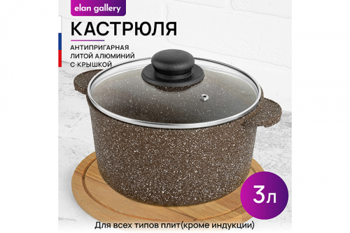 Кастрюля Elan Gallery "Коричневый опал" из серии "Гармония вкуса" объёмом 3 литра с крышкой равномерно разогревается и распределяет тепло таким образом, что продукты в ней остаются сочными и сохраняют все полезные свойства и аромат. Диаметр стеклянной крышки – 20 см, диаметр дна – 15,5 см. Кастрюля с прозрачной крышкой выполнена из толстостенного литого алюминия и имеет ультрапрочное двухслойное антипригарное покрытие Cookmark. Покрытие устойчиво к царапинам и износу, полностью безопасно для здоровья и не содержит PFOA или других вредных веществ. Крышка изготовлена из жаропрочного стекла и имеет пароотвод. Алюминиевая кастрюлька с толстыми дном и стенками выполнена в стильном дизайне и позволит приготовить дома суп, кашу, плов или любой гарнир. Порадуйте близких супом с фрикадельками, борщом или куриной лапшой. Удобна для приготовления пасты, так как макаронные изделия не будут прилипать на дно благодаря антипригарной поверхности. Суповая кастрюля подойдёт для тушения и варки блюд из мяса, рыбы и овощей. Эксплуатация: кухонную утварь не нагревать без продуктов. Дайте посуде остыть, прежде чем помещать ее в воду. Использовать только деревянные и силиконовые приборы. Не мыть абразивными или щелочными моющими средствами. Использовать в ПММ только в режиме "Эко" с применением средств, не содержащих щелочи. Подходит для стеклокерамических, газовых и электрических плит. Не подходит для индукционных плит! Без крышки можно использовать в духовой печи при температуре до 250 градусов. Теперь для использования в духовке не понадобится отдельная ёмкость. Кастрюля станет идеальным подарком для женщин на 8 Марта или День Рождения и придаст процессу приготовления пищи новый уровень комфорта. Подарите такую универсальную вещь маме, подруге, сестре или бабушке. Красивая кастрюля – мечта любой хозяйки! В серии "Гармония вкуса" вы найдёте любой кухонный инвентарь: сковороды, кастрюли, блинницы, казаны и жаровни. Соберите набор для вашей кухни или столовой в едином стиле! /