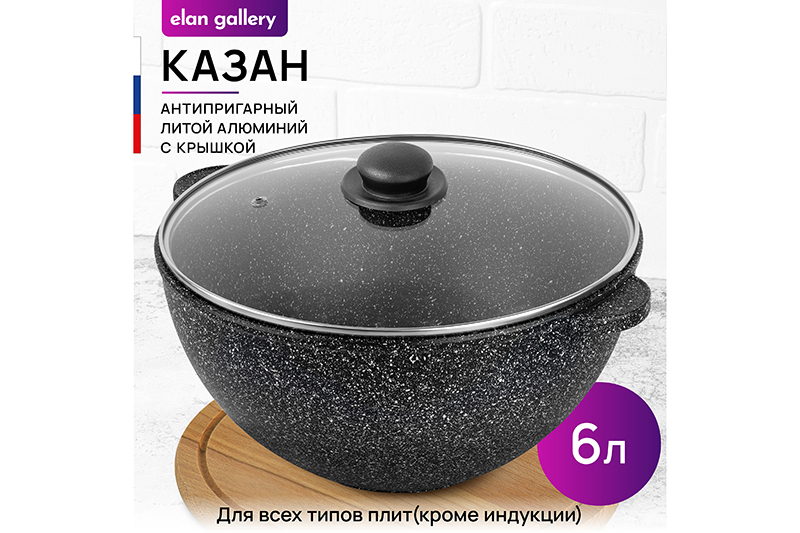 Казан "Гармония вкуса" объемом 6 литров с крышкой равномерно разогревается и распределяет тепло таким образом, что продукты в нем остаются сочными и сохраняют все свои полезные и вкусовые свойства. Казан выполнен из толстостенного литого алюминия и имеет ультрапрочное двухслойное антипригарное покрытие Cookmark. Покрытие устойчиво к царапинам и износу, полностью безопасно для здоровья и не содержит PFOA или других вредных веществ. Эксплуатация: не нагревать без продуктов. Дайте посуде остыть, прежде чем помещать ее в воду. Использовать только деревянные и силиконовые приборы. Не мыть абразивными или щелочными моющими средствами. Использовать в посудомоечной машине только в режиме "Эко". Подходит для всех типов плит, кроме индукционных. Можно использовать в духовом шкафу без крышки при температуре до 250 градусов. /