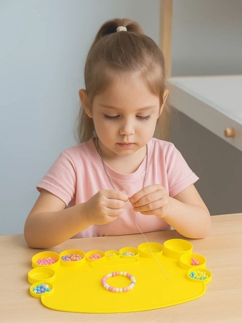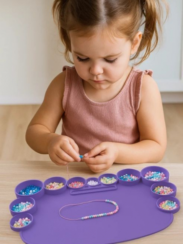 Силиконовый коврик для рукоделия поможет развить творческие способности ребенка! Эластичный коврик не скользит даже по наклонной поверхности, а ограничительный бортик и не позволит мелким деталям потеряться. Коврик легко складывается, благодаря чему его удобно взять с собой. Благодаря удобным секциям для хранения он идеален для работы с мелкими деталями: бисером, бижутерией, лего. Легко моется проточной водой.