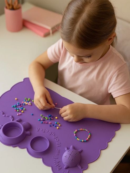 Силиконовый коврик для рукоделия поможет развить творческие способности ребенка! Эластичный коврик не скользит даже по наклонной поверхности, а ограничительный бортик и не позволит мелким деталям потеряться. Коврик легко складывается, благодаря чему его удобно взять с собой. Благодаря удобным секциям для хранения он идеален для работы с мелкими деталями: бисером, бижутерией, лего. Легко моется проточной водой.