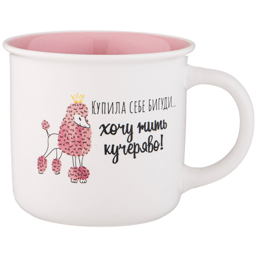 Кружка TM Lefard лаконичной формы с надписью " Купила себе бигуди, хочу жить кучеряво" имеет удобную ручку и отличный объем 355 мл. Кружка изготовлена из качественного фарфора. Отличный выбор для подарка. Продукция сертифицирована и безопасна для контакта с пищевыми продуктами. Можно ставить в микроволновую печь и мыть в посудомоечной машине