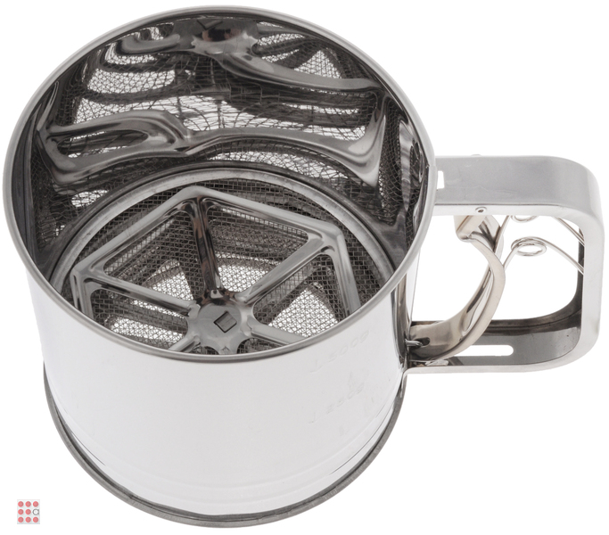 Незаменимая помощница на кухне кружка-сито механическая легко просеет муку, крахмал, какао или сахарную пудру, даже в узкую емкость . Это сито порадует Вас компактными размерами и прочностью. Оно очень удобно в работе: нужно только засыпать в него муку и несколько раз нажать ручку.