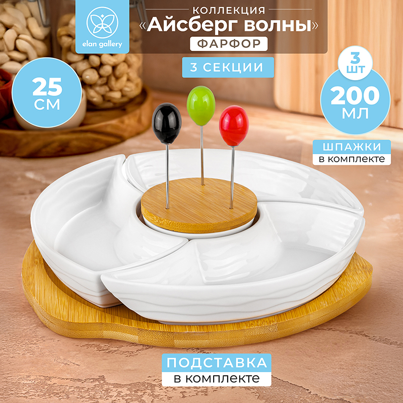 Менажница из серии «Айсберг волны» от Elan Gallery предназначена для эстетичной сервировки вашего стола. Общий размер изделия – 25х25х6 см. Состоит из 4 секций. Объём каждой большой секции – 200 мл. Объём центральной секции – 100 мл. Она предназначена для хранения трёх шпажек, поставляющихся в комплекте. Шпажки выполнены из металла. Ёмкости выполнены из высококачественного белого фарфора. Он не впитывает цвет продуктов и легко отмывается, благодаря чему надолго сохраняет свою белизну. Поверхность изделий украшают рельефные узоры в виде поперечных волн. Крутящаяся подставка и подставка для шпажек выполнены из натурального бамбука. Менажница поможет красиво подавать маслины, орехи или сыры. Она станет незаменимым элементом праздничных обедов или неторопливых завтраков. Послужит в качестве конфетницы, позволив угостить себя и гостей любимыми сладостями: конфетами, мармеладом, леденцами или безе. Вращающаяся бамбуковая подставка позволит легко достать нужное угощение, не нарушив целостность композиции. Металлические шпажки помогут вам взять угощение. Не рекомендуется применять абразивные моющие средства. Без бамбуковых деталей и шпажек подходит для использования в посудомоечной машине и микроволновой печи. Бамбук нельзя замачивать! Поставляется в дизайнерской картонной коробке – благодаря ей вам не потребуется дополнительная подарочная упаковка. Фарфоровая сервировочная посуда будет оригинальным подарком для хозяйки, ценящей не только практичность, но и привлекательность. Серия «Айсберг волны» от бренда Элан Галерея станет украшением любого кухонного инвентаря и позволит собрать красивый сервиз в едином стиле! /