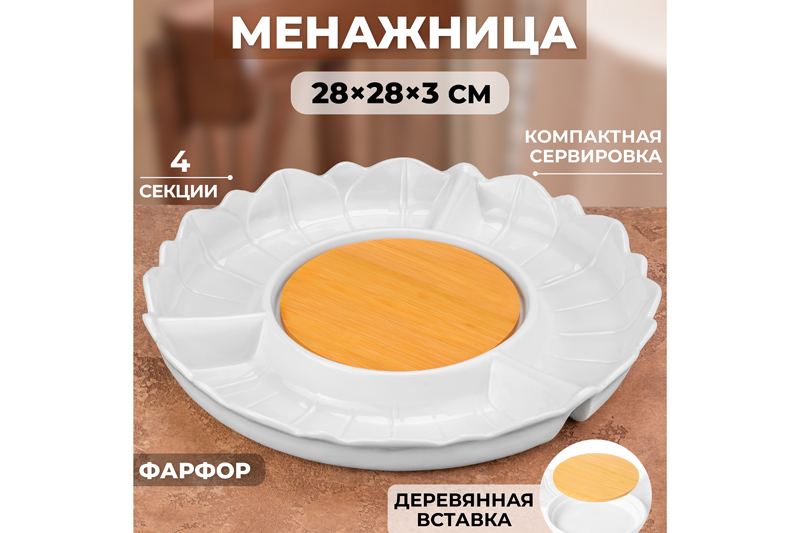 Менажница Elan Gallery "Цветок" размером 28х28х3,5 см изготовлена из фарфора и имеет декоративную бамбуковую вставку размером 13х13х1 см. При желании круглую вставку из бамбука можно убрать и использовать центральную секцию для продуктов. Блюдо выполнено в оригинальной форме, напоминающей цветок. Представляет собой цельную тарелку с четырьмя секциями. Объём трёх секций по краям – по 200 мл каждая, размер центральной секции без бамбуковой вставки – 15х15х2 см. Менажница подойдет для сервировки и подачи различных закусок: сырной и мясной нарезки, канапе или роллов. Сервировочное блюдо пригодится, чтобы создать идеальную атмосферу для приема гостей или романтического ужина дома. Благодаря отдельным секциям вы можете использовать одну и ту же тарелочку для солений, оливок, сыра и колбасы. Такой подход к сервировке позволит сэкономить место на вашем столе. Возьмите менажницу на пикник, её эргономичная форма позволит разместить все необходимые закуски или сладости. Положите в неё свежие овощи, фрукты или ягоды. Фарфоровая посуда отличается от керамической повышенной плотностью. Фарфор не впитывает цвет продуктов и не деформируется от влаги, чему может быть подвержена керамика. Не рекомендуется применять абразивные моющие средства. Без бамбуковой вставки можно использовать в микроволновой печи и посудомоечной машине. Детали из бамбука нельзя замачивать! Поставляется в стильной картонной упаковке. Посуда из белого фарфора с бамбуковыми деталями подойдёт к любому интерьеру кухни и станет отличным подарком для любой хозяйки. Сервировочное блюдо станет настоящим украшением вашего стола как в будни, так и на праздник! /