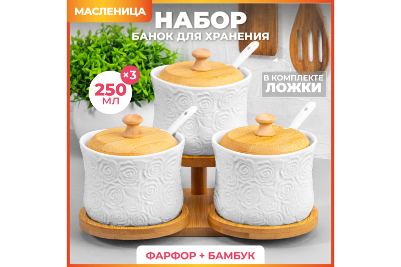 Набор 3 банок из серии «Розы» от Elan Gallery послужит для организации хранения сыпучих продуктов на вашей кухне. Размер каждой ёмкости – 9х8,8х9 см, объём – 250 мл. Выполнены из высококачественного белого фарфора. Он не впитывает цвет продуктов и легко отмывается, благодаря чему надолго сохраняет свою белизну. Поверхность изделий украшают рельефные узоры в виде пышных бутонов роз. Подставка и крышки выполнены из натурального бамбука. Размер подставки – 20,5х17,5х5,5 см. Ёмкости подойдут для хранения разнообразных сыпучих продуктов. Заполните их сахаром и солью, специями и приправами, чтобы во время приготовления и приёма пищи всё необходимое было под рукой. Засыпьте внутрь чай или кофе, чтобы в любой момент заварить свежий напиток. Подайте их вместе с горячими блюдами, чтобы каждый мог приправить пищу по своему вкусу. Маленькие ложечки позволят удобно набрать необходимое количество продуктов. Они компактно помещаются в баночке благодаря выемкам на крышках. Такие изделия отлично дополнят сервировку стола как для сытного завтрака, так и для уютного чаепития. Не рекомендуется применять абразивные моющие средства. Без бамбуковых элементов подходят для использования в посудомоечной машине и микроволновой печи. Бамбук нельзя замачивать! Поставляются в дизайнерской картонной коробке – благодаря ей вам не потребуется дополнительная подарочная упаковка. Фарфоровая сервировочная посуда будет оригинальным подарком для хозяйки, ценящей не только практичность, но и привлекательность. Серия «Розы» от бренда Элан Галерея станет украшением любого кухонного инвентаря и позволит собрать красивый сервиз в едином стиле!