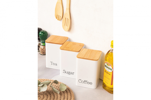 Набор состоит из трёх белых банок для сыпучих продуктов с бамбуковыми крышками. Объём каждой банки – 1,1 литра, размер – 9,5х9,5х14,5 см. Банки выполнены из высококачественного металла, что обеспечивает прочность и долговечность использования. Украшены надписями "Tea", "Сoffee", "Sugar" ("Чай", "Кофе", "Сахар"). Бамбуковые крышки позволяют сохранить свежесть и аромат продуктов, а также защищают содержимое от пыли и влаги. Банки для сыпучих продуктов позволят не просто хранить чай, кофе и сахар на вашей кухне, но и станут элементом её декора. Можно использовать для соли, приправ, специй, круп или орехов. Декоративная посуда поможет не только навести порядок на вашей кухне, ее стильный дизайн подойдет к любому интерьеру и поможет создать на кухне уют. Используйте банки не только для сыпучих продуктов, но и конфет, печенья и других сладостей. Кухонные баночки подойдут к интерьеру в любом стиле. Не рекомендуется применять абразивные моющие средства. Не использовать в СВЧ и ПММ. Весь набор выполнен в стильном и элегантном дизайне и может стать прекрасным украшением вашего интерьера. Идеальный вариант подарка для мамы, бабушки, сестры и даже коллеги. Такая посуда станет настоящим украшением вашей кухни и поможет создать в доме порядок и уют! /