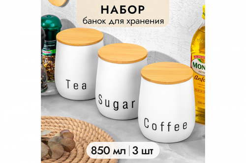 Набор 3 банок для сыпучих продуктов с бамбуковыми крышками от бренда Elan Gallery по 850 мл (каждая) станет удобным и эстетичным дополнением вашей кухни. Размер каждого изделия – 10,5х10,5х12,5 см, высота каждой банки без крышки – 12 см. Круглые ёмкости чёрного цвета выполнены из металла и плотно закрываются бамбуковыми крышками благодаря силиконовому уплотнителю. Ёмкости позволят красиво хранить продукты на полке или в шкафу. Благодаря стильному дизайну подходят для эстетичного хранения на столе, а также для сервировки. Каждая металлическая банка украшена надписью: "Tea"("Чай"), "Coffee"("Кофе"), "Sugar"("Сахар"). Комплект трёх контейнеров позволит не просто хранить чай, кофе и сахар на вашей кухне, но и станет элементом её декора. Кухонные баночки для сыпучих продуктов подойдут к интерьеру в любом стиле, от скандинавского до лофт. Не рекомендуется применять абразивные моющие средства. Нельзя использовать в микроволновой печи и посудомоечной машине. Бамбук нельзя замачивать. Поставляются в стильной картонной коробке. Набор посуды из 3 предметов станет украшением кухни или приятным подарком на любой праздник. Благодаря красочной коробочке не потребуется подарочная упаковка. В коллекции бренда Элан Галерея представлено много кухонных органайзеров, сахарниц, столового инвентаря и других стильных товаров для дома. Выберите вариант на свой вкус.