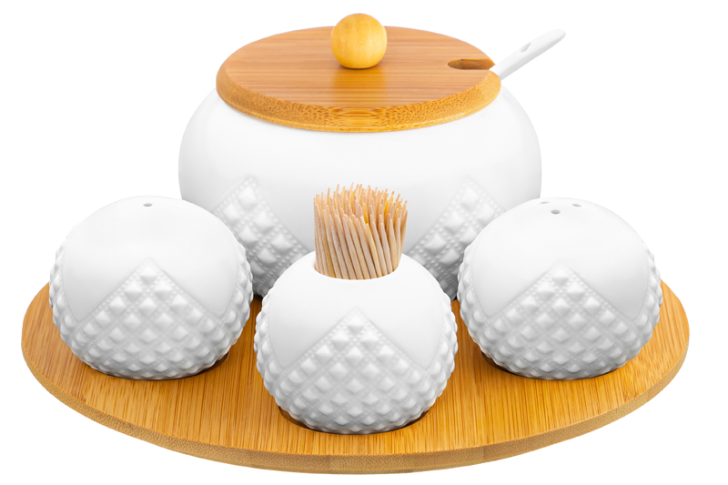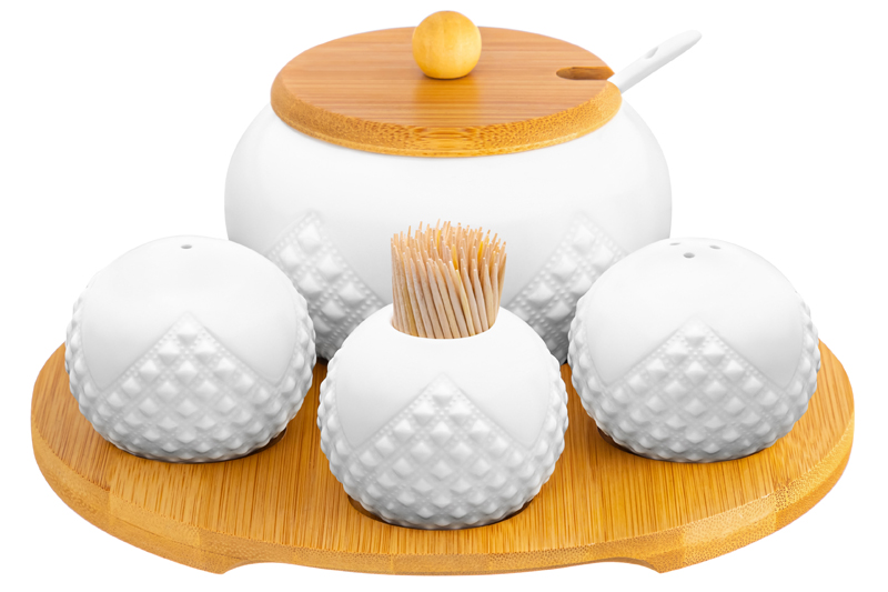 Набор посуды на деревянной подставке из серии «Ромбики» от Elan Gallery предназначен для эстетичной сервировки вашего стола. Включает в себя сахарницу с ложкой, вазочку под зубочистки и набор для специй. Выполнены из высококачественного белого фарфора. Он не впитывает цвет продуктов и легко отмывается, благодаря чему надолго сохраняет свою белизну. Поверхность украшена рельефным геометрическим узором. Подставка и крышка сахарницы выполнены из натурального бамбука. Размер подставки – 20,5х20,5х1 см. Комплект станет воплощением прекрасного вкуса. Размер сахарницы – 11х11х9,5 см, объём – 310 мл. Ёмкость подойдёт для хранения не только сахара, но и соли, специй и приправ. Засыпьте внутрь чай или кофе, чтобы в любой момент заварить свежий напиток. Подайте её вместе с горячими блюдами, чтобы каждый мог приправить пищу по своему вкусу. Эстетичную ёмкость также можно приспособить под варенье, мёд или икру. Маленькая ложечка позволит удобно набрать необходимое количество продуктов. Она компактно помещается в баночке благодаря выемке на крышке. Такое изделие отлично дополнит сервировку стола как для сытного завтрака, так и для уютного чаепития. Набор для специй позволит держать под рукой необходимые приправы. Наполняются через отверстие снизу и закрываются пластиковой пробкой. Вазочка для зубочисток станет удобной гигиенической принадлежностью. Зубочистки не входят в комплект. Размер каждого изделия – 6х6х5 см, объём – 75 мл. Не рекомендуется применять абразивные моющие средства. Без бамбуковых элементов подходят для использования в микроволновой печи и посудомоечной машине. Поставляются в дизайнерской картонной коробке – благодаря ей вам не потребуется дополнительная подарочная упаковка. Фарфоровая сервировочная посуда будет оригинальным подарком для хозяйки, ценящей не только практичность, но и привлекательность. Серия «Ромбики» от бренда Элан Галерея станет украшением любого кухонного инвентаря и позволит собрать красивый сервиз в едином стиле! /