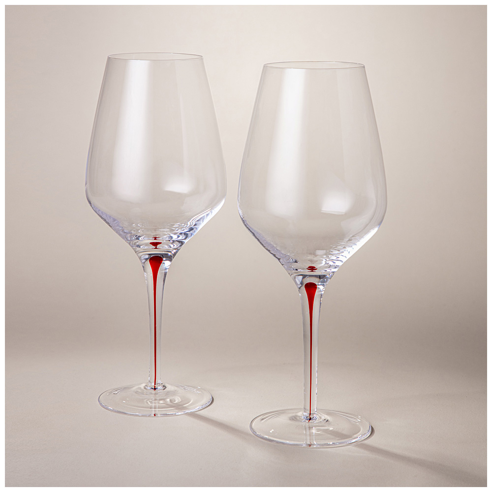 Бокалы украшены тонкими полосами ярких цветов (синий, красный), которые добавляют изюминку без перегрузки дизайна. Эти акценты не только декоративны, но и служат отличительной чертой каждой пары бокалов.