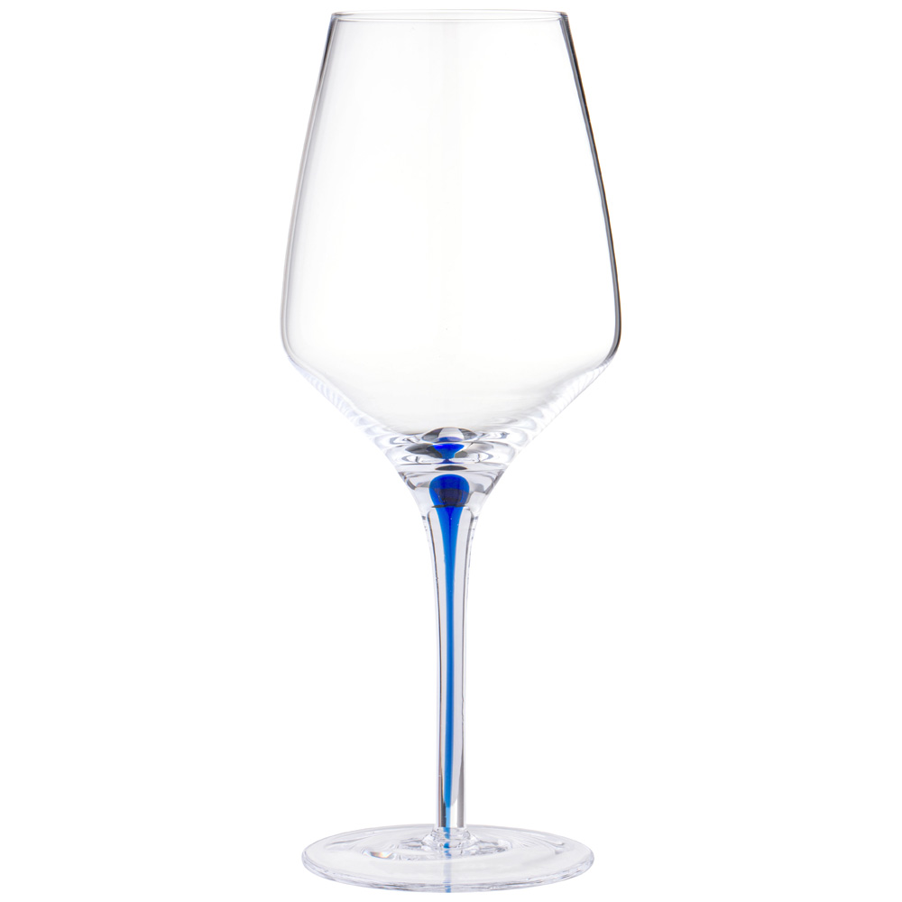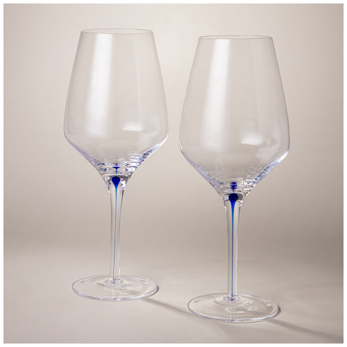 Бокалы украшены тонкими полосами ярких цветов (синий, красный), которые добавляют изюминку без перегрузки дизайна. Эти акценты не только декоративны, но и служат отличительной чертой каждой пары бокалов.