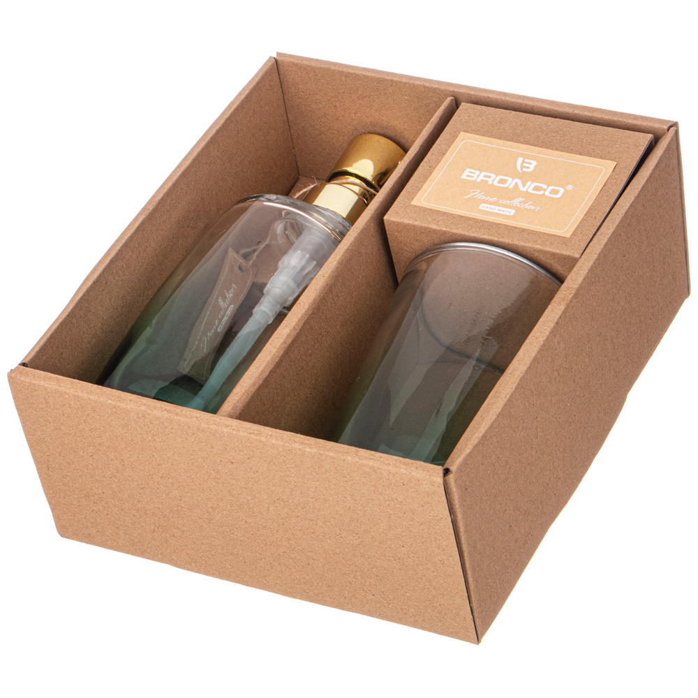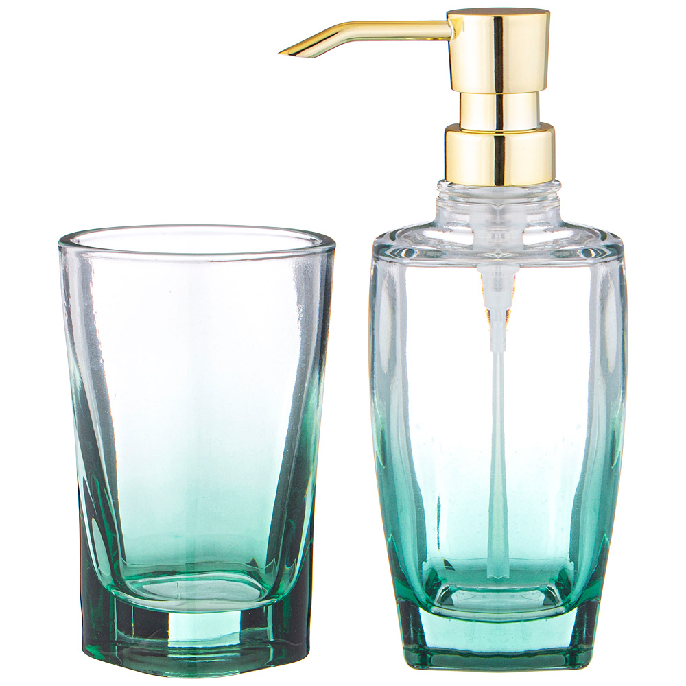 Набор аксессуаров для ванной комнаты состоит из дозатора для жидкого мыла и подставки-стакана.