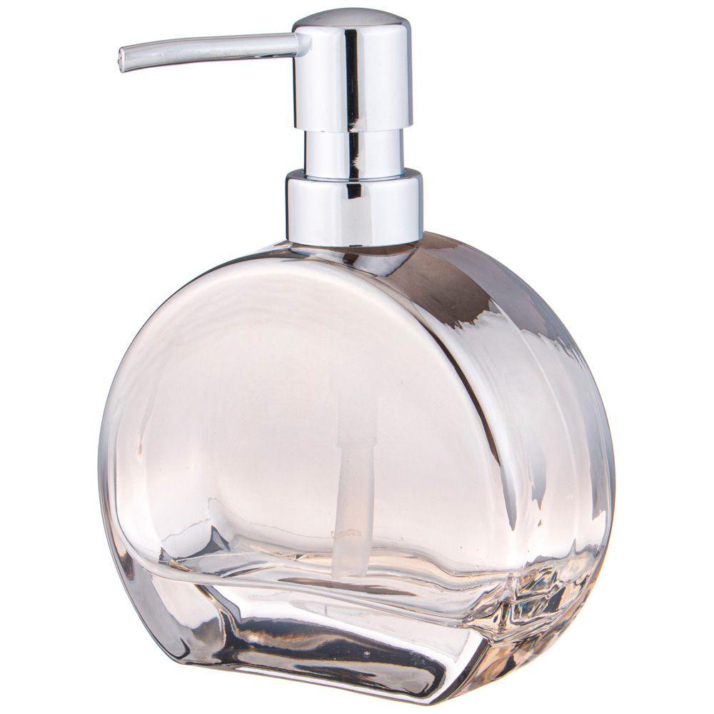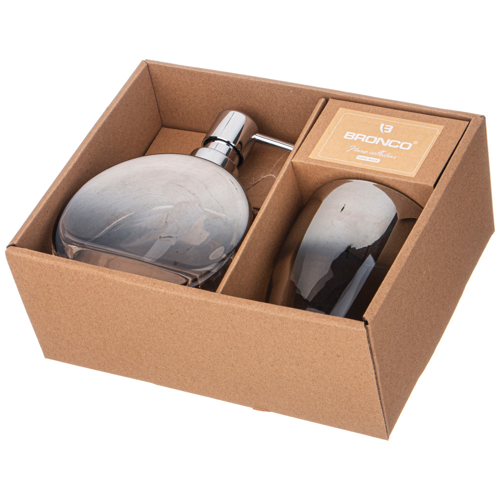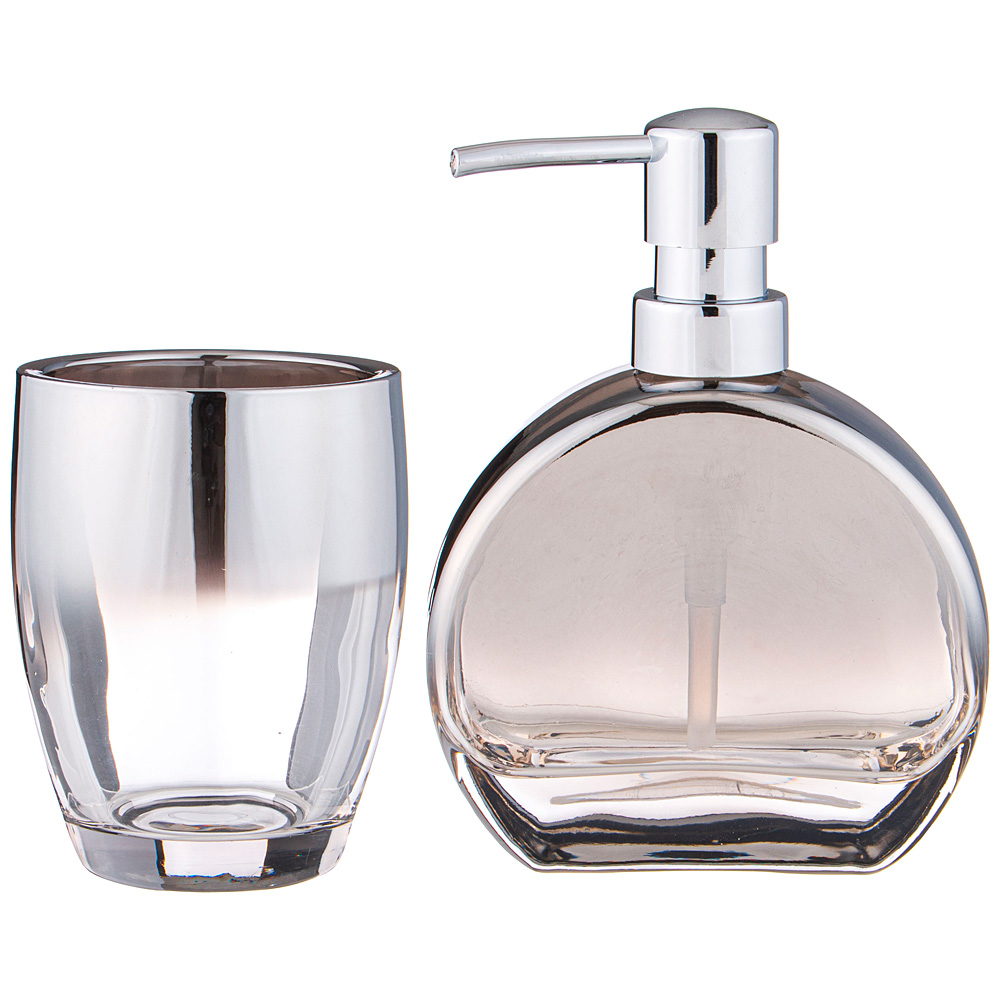 Набор аксессуаров для ванной комнаты состоит из дозатора для жидкого мыла и подставки-стакана.