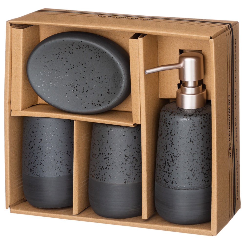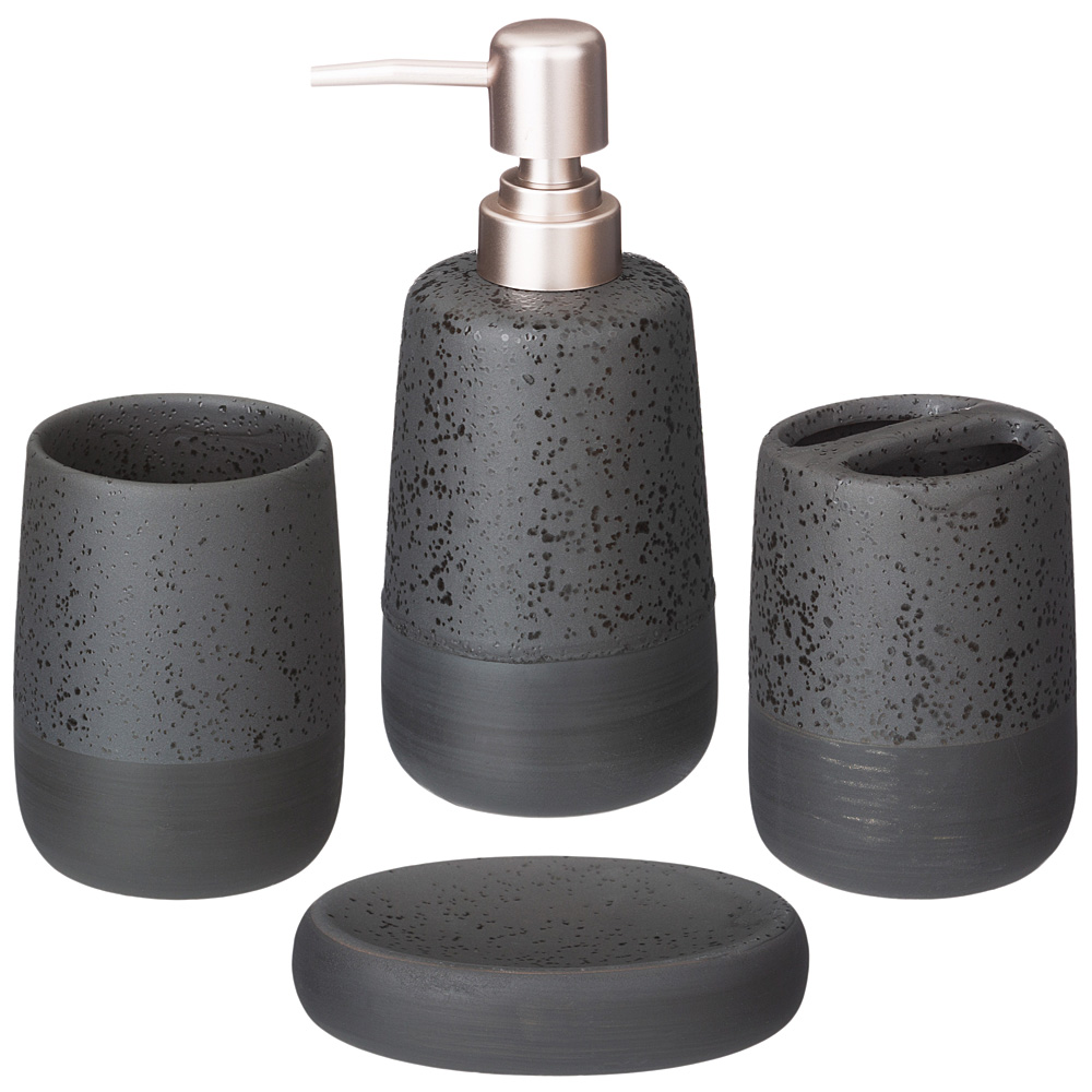 Набор аксессуаров для ванной комнаты состоит из дозатора для жидкого мыла, подставки-стакана, подставки для зубных щёток и мыльницы для кускового мыла.