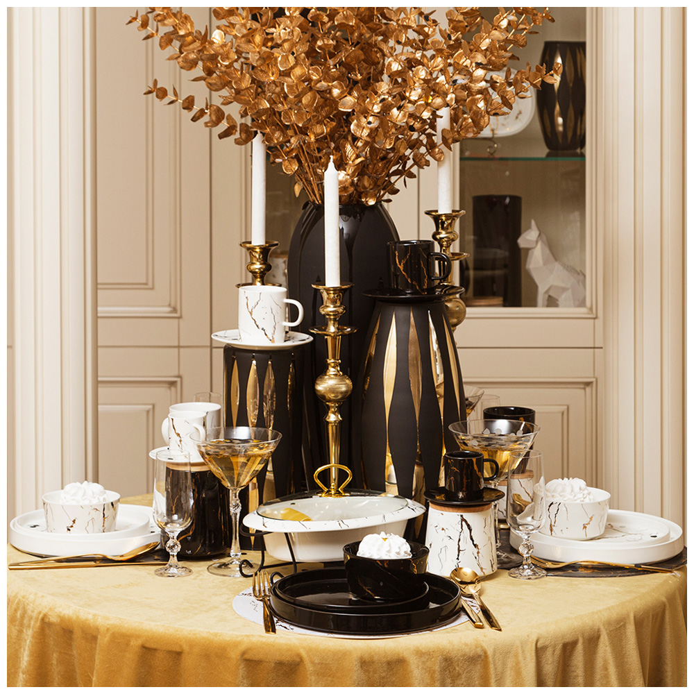Коллекция "Fantasy" ТМ LEFARD - это модная сервировка стола и стильный кухонный интерьер в классическом черном с золотом цвете. Блюда и формы различных размеров, менажницы на бамбуковых подставках, банки, тарелки и салатники различного назначения, чайники, чайные пары и кружки выполнены из упрочненного фарфора. Четкие линии, сверкающее глянцевое покрытие. Вы и Ваш стол неотразим! Посуда прошла сертификацию. Безопасна для контакта с пищевыми продуктами. Можно использовать в микроволновой печи. Не рекомендуется мыть в посудомоечной машине.
