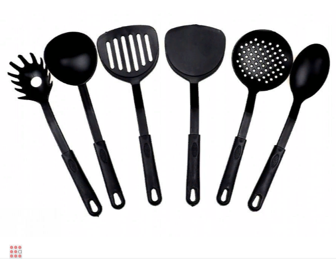 Набор кухонных принадлежностей из термостойкого пластика необходим на каждой кухне. Любая домохозяйка мечтает иметь такой набор на своей кухне. Состоит из 6 предметов: Половник, Шумовка, Лопатка, Ложка, Ложка для спагетти, Лопатка с прорезями.