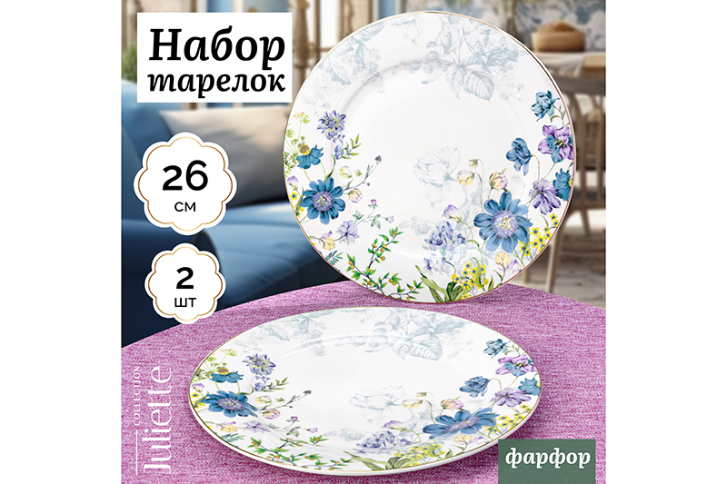 Набор из двух круглых тарелок Elan Gallery "Juliette" станет украшением вашей кухни. "Juliette" — это коллекция посуды из высококачественного фарфора new bone china с изящным цветочным рисунком и золотым окаймлением. Серия вдохновлена атмосферой очарования французской провинции и переносит нас в загадочный сад. Размер каждой тарелки – 26,5х26,5х2 см. Большие тарелки для подачи на стол ваших любимых блюд станут незаменимой вещью в любом доме. Комплект подойдёт для любых закусок, например, фруктов или нарезки. Каждая тарелка станет незаменимым помощником при сервировке завтрака, ужина или вторых блюд на обед. Эргономичная форма позволит разместить на них любую еду, от блинов до пасты. Фарфоровая посуда отличается от керамики повышенной плотностью. Фарфор не впитывает цвет продуктов и не деформируется от влаги, чему может быть подвержена керамическая посуда. Универсальный набор подойдёт для сервировки стола не только в будни, но и на праздник. Не рекомендуется применять абразивные моющие средства. Из-за золотого окаймления не подходит для использования в микроволновой печи и посудомоечной машине. Поставляется в подарочной картонной упаковке. Станет отличным подарком для любой хозяйки, которая ценит стильную сервировку. Серия "Juliette" пробуждает романтическое воображение и поможет создать неповторимую атмосферу на любой кухне! /