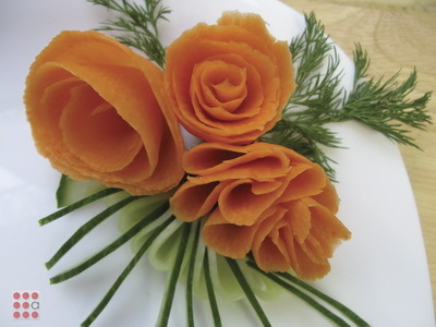 3. Вырезать оригинальную «стружку» из моркови, огурцов или цуккини, которую можно использовать для приготовления полезных, вкусных, а главное – красивых, блюд. Из такой стружки повара складывают оригинальные «гвоздики», «розы» и другие элементы оформления, украшающие салаты и вторые блюда.