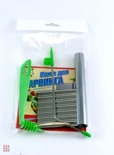 Входит 3 ножа:1- для удаления сердцевины и фарширования овощей,2 -для нарезки спиралью, 3-для нарезки волной и сеточкой, а также для соломки.