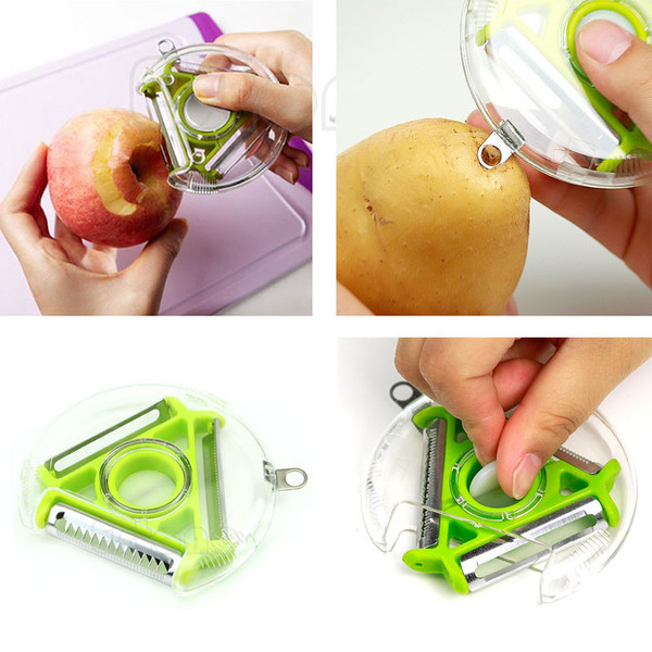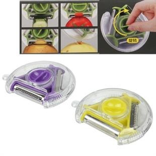 Овощечистка 3 в 1 Трио состоит из трех специальных лезвий на вращающемся диске, соединенных в одном компактном корпусе. При помощи этого приспособления можно выполнять несколько операций - чистить картофель, делать соломку и, конечно же, срезать кожицу с овощей и фруктов.