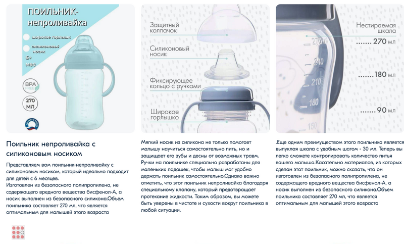 Основная задача первой ступени - помочь малышу сформировать навык питья из поильника и плавно перейти от бутылочки к самостоятельному питью. Для удобства использования поильник имеет эргономичную форму чашки и ручек . Объем выпиваемой жидкости позволяет контролировать мерная шкала, нанесенная на чашку. Форма и положение носика поильника, во время питья, способствует правильному расположению губ и языка ребёнка. Носик поильника выполнен из экстра-мягкого силикона с бархатистой текстурой - он идеально подходит для нежных детских десен. Защита от протеканий поильника исключит проливание жидкости.- Форма носика способствует правильному положению губ и языка ребенка во время питья; - Специальная конструкция носика против протекания препятствует проливанию жидкости