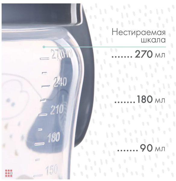 Продукция изготовлена из прочного, безопасного полипропилена (РР5) и силикона, качество которого соответствует техническому регламенту Таможенного союза - ТР ТС 007/2011. Материал бутылочки абсолютно безопасен для здоровья, не выделяет токсичных веществ при нагревании, не придает пищевым продуктам посторонний вкус или аромат, не содержит Бисфенол А. Силикон не деформируется от влаги, не способствует росту грибков, образованию плесени и развитию бактерий.