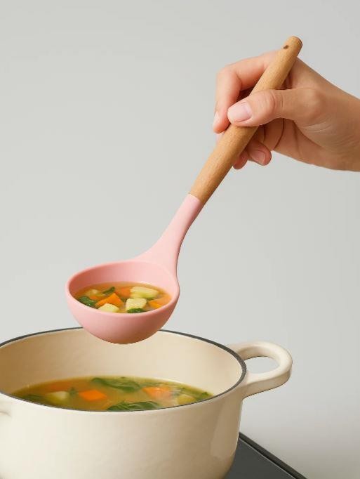 Изготовлено: рабочая часть из силикона, ручка из дерева. Общая длина 31 см, ёмкость чаши половника 90 мл.