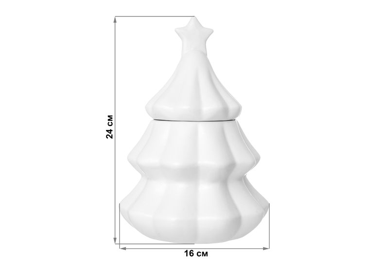 Банка “Новогодняя ёлка” предназначена для хранения разнообразных сыпучих продуктов. Размер изделия – 16х16х24 см, объём – 1,25 литра. Выполнена из высококачественного белого фарфора в форме ёлки. Фарфор легко отмывается и не впитывает цвет продуктов. На крышке имеются силиконовые уплотнители, которые обеспечат её плотную посадку. Положите в баночку чай, кофе, сахар или соль. Заполните её специями и приправами, чтобы во время готовки всё необходимое было под рукой. Большая и вместительная банка также подойдёт для макаронных изделий и круп, для ваших любимых конфет, печений и других сладостей. Благодаря необычной форме она послужит и в декоративных целях. Вы можете поставить её на стол, полку или тумбочку в качестве статуэтки. Наполните баночку без крышки еловыми веточками или карамельными тростями для создания праздничной атмосферу. В комнате, гостиной и прихожей подойдёт для хранения резинок и заколок для волос, ниток и других мелочей. Не рекомендуется применять абразивные моющие средства. Банку без крышки можно использовать в посудомоечной машине и микроволновой печи. Поставляется в красивой картонной упаковке. Банка станет прекрасным подарком на Новый год или Рождество и украшением вашего кухонного инвентаря.