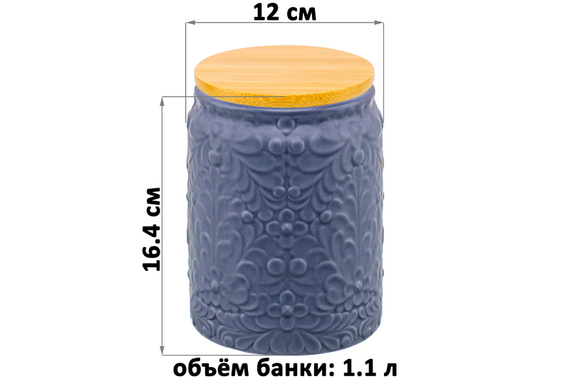 Банка от Elan Gallery предназначена для организации хранения продуктов на вашей кухне. Размер ёмкости – 12х12х16,4 см, объём – 1,1 литр. Выполнена из керамики и имеет серо-синий цвет, матовая поверхность украшена рельефным лиственным орнаментом. Крышка выполнена из натурального бамбука и оснащена силиконовым уплотнителем. Изделие отлично подойдёт для хранения сыпучих продуктов: сахара и соли, чая и кофе, приправ и специй. Храните в баночке ягоды, орехи и сухофрукты. Заполните её любимыми сладостями: леденцами, конфетами или печеньем. Подайте к столу, чтобы идеально дополнить чайную сервировку! Герметичная деревянная крышечка защитит ваши продукты от попадания грязи и пыли. Коллекция из двух баночек лаконичных цветов впишется в любой интерьер и позволит организовать хранение даже на открытых полках. Не рекомендуется применять абразивные моющие средства. Не подходит для использования в микроволновой печи. Без бамбуковой крышки подходит для посудомоечной машины. Бамбук нельзя замачивать! Поставляется в дизайнерской картонной коробке – благодаря ей вам не потребуется дополнительная подарочная упаковка. Это идеальный подарок для хозяйки, ценящей не только практичность, но и стиль. В ассортименте бренда Элан Галерея представлены банки для хранения на любой вкус. Соберите целый набор кухонных контейнеров для эстетичного хранения продуктов на вашей кухне!