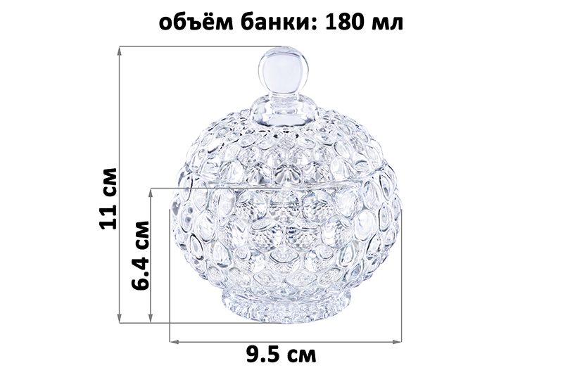 Банка для хранения Elan Gallery "Пузырьки" выполнена из прозрачного стекла и украшена декоративным рельефным узором. Размер изделия – 9,5х9,5х11 см, объём – 180 мл. Высота без крышки – 6,4 см. Прозрачная баночка с крышкой подойдёт для хранения мёда, варенья, сахара и соли. Можно использовать её как ёмкость для чая, кофе и других сыпучих продуктов. Декоративная баночка круглой формы станет гармоничным дополнением при сервировке вашего стола как в будни, так и на праздник. Красивый дизайн позволит использовать её не только для хранения продуктов, но и для подачи на стол в роли медового горшочка. Положите в неё конфеты или икру, чтобы удивить гостей изящной сервировкой. Стеклянную ёмкость с крышечкой можно использовать не только как сахарницу, икорницу или соусник, но и для специй и приправ. Это позволит держать под рукой всё необходимое во время приготовления и приёма пищи. На даче медовница будет незаменимой для семейного чаепития, а также подойдёт для подачи ягод. В качестве альтернативы красивый бочонок можно использовать как шкатулку или органайзер для ватных палочек, дисков и других предметов гигиены. Сложите в неё украшения, бижутерию, а также резинки и заколки. Подходит в роли формы для свечей. Не рекомендуется применять абразивные моющие средства. Можно мыть в посудомоечной машине. Нельзя использовать в микроволновой печи. Поставляется в картонной упаковке. Красивая посуда – это отличный подарок на любой праздник. Баночка для хранения станет многофункциональным дополнением вашего кухонного инвентаря или интерьерным украшением ванной и комнаты!