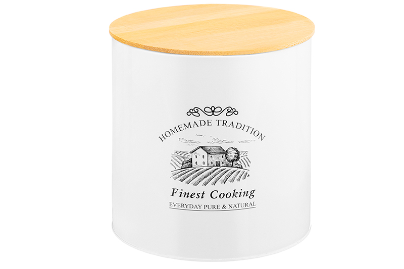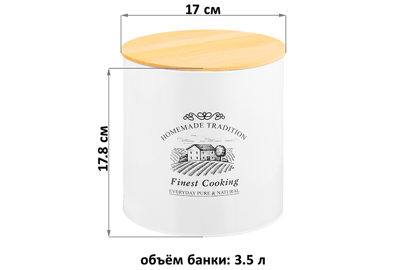 Банка для хранения послужит органайзером на вашей кухне. Размер ёмкости – 17х17х17,8 см, объём – 3,5 литра. Выполнена из жести, крышка выполнена из бамбука. На белую поверхность нанесён минималистичный рисунок в виде деревенского домика на фоне полей, а также надписи на английском: «Homemade tradition. Finest cooking. Everyday pure & natural» («Домашняя традиция. Лучшая кулинария. Ежедневная чистота и натуральность»). Изделие отлично подойдёт для разнообразных сыпучих продуктов: чая, кофе, сахара и соли, приправ и специй. Храните в ней крупы и макаронные изделия, а также ягоды, орехи и сухофрукты. Заполните контейнер сладостями и закусками: конфетами, леденцами или печеньем. Подайте баночку к столу, чтобы идеально дополнить чайную сервировку! Герметичная крышка защитит ваши продукты от попадания пыли и грязи. Не рекомендуется применять абразивные моющие средства. Не подходит для использования в посудомоечной машине и микроволновой печи. Бамбук нельзя замачивать! Поставляется в красивой картонной коробке – благодаря ей вам не потребуется дополнительная подарочная упаковка. Это идеальный подарок для хозяйки, ценящей не только практичность, но и стиль. Баночка создаст уют тёплой домашней атмосферы и подчеркнёт вашу оригинальность!