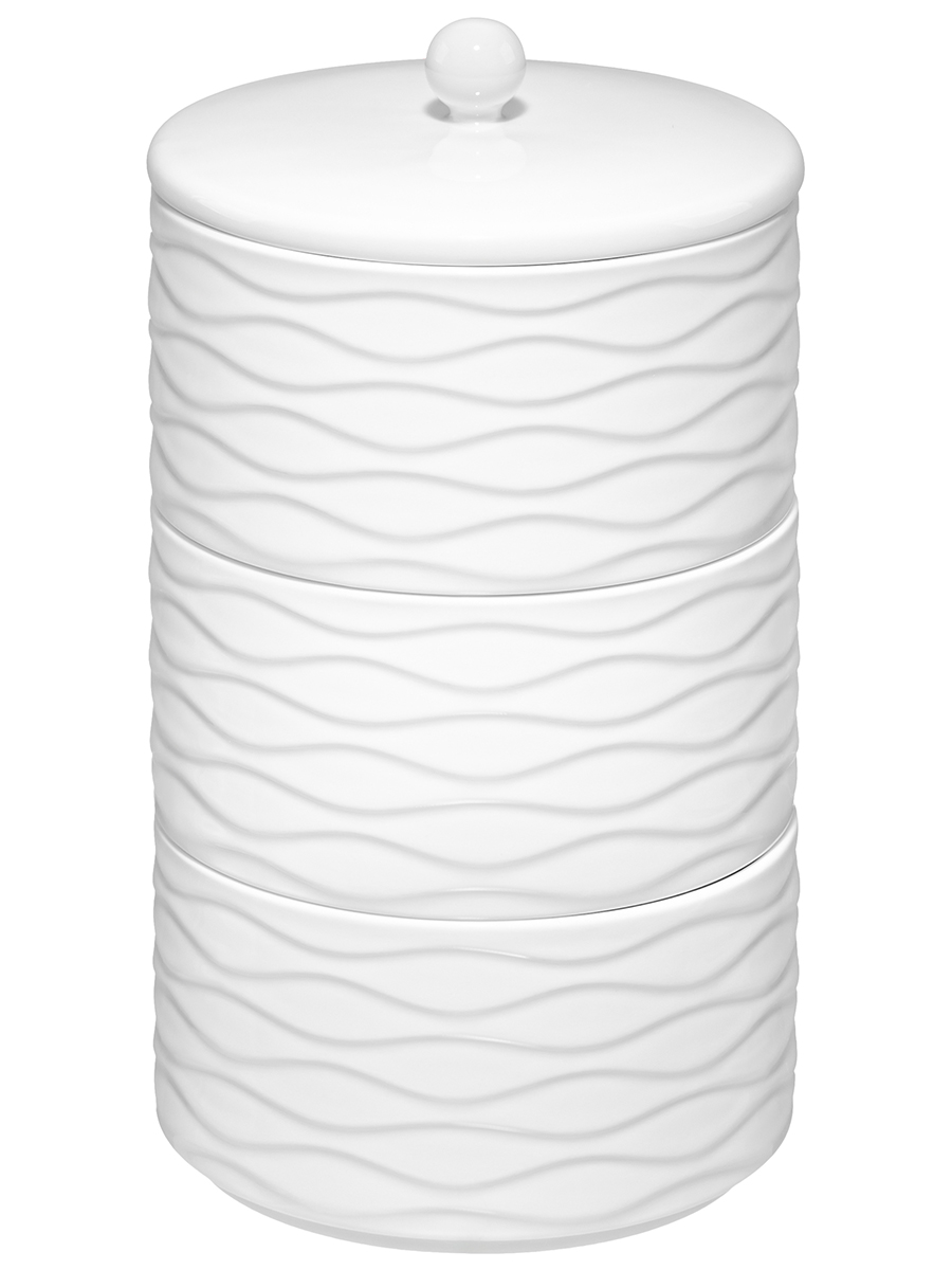 Трёхсекционная банка из серии «Айсберг волны» от Elan Gallery предназначена для организации хранения сыпучих продуктов. Общий размер изделия – 11,5х11,5х21 см. Размер каждой секции – 11,5х11,5х6 см, объём – 400 мл. Выполнена из высококачественного белого фарфора. Он не впитывает цвет продуктов и легко отмывается, благодаря чему надолго сохраняет свою белизну. Поверхность изделия украшена рельефом в виде поперечных волн. Банка состоит из трёх штабелируемых ёмкостей, каждая из которых подойдёт для хранения или сервировки разнообразных продуктов. Заполните их солью или сахаром, специями и приправами, чтобы во время приготовления пищи всё необходимое было под рукой. Насыпьте внутрь чай или кофе, чтобы в любой момент заварить свежий напиток. Подайте баночки вместе с горячими блюдами, чтобы каждый мог приправить пищу по своему вкусу. Дополните чайную сервировку, поместив в каждую мисочку сладости: конфеты, печенье, пряники, мармелад или зефир. Используйте для подачи разнообразных закусок: оливок, маслин, орехов или сухофруктов. Они также подойдут для запекания порционных блюд в духовке. Не рекомендуется применять абразивные моющие средства. Подходят для использования в посудомоечной машине, микроволновой печи и духовом шкафу при температуре до 230 градусов. Поставляются в дизайнерской картонной коробке – благодаря ей вам не потребуется дополнительная подарочная упаковка. Фарфоровая сервировочная посуда будет оригинальным подарком для хозяйки, ценящей не только практичность, но и привлекательность. Серия «Айсберг волны» от бренда Элан Галерея станет украшением любого кухонного инвентаря и позволит собрать красивый сервиз в едином стиле!