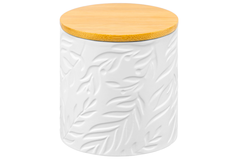 Банка от Elan Gallery предназначена для организации хранения продуктов на вашей кухне. Размер ёмкости – 10х10х11 см, объём – 430 мл. Выполнена из керамики и имеет белый цвет, поверхность украшена рельефным лиственным узором. Крышка выполнена из натурального бамбука и оснащена силиконовым уплотнителем. Изделие отлично подойдёт для хранения сыпучих продуктов: сахара и соли, чая и кофе, приправ и специй. Храните в баночке ягоды, орехи и сухофрукты. Заполните её любимыми сладостями: леденцами, конфетами или печеньем. Подайте к столу, чтобы идеально дополнить чайную сервировку! Герметичная деревянная крышечка защитит ваши продукты от попадания грязи и пыли. Коллекция из трёх баночек нежных природных цветов впишется в любой интерьер и позволит организовать хранение даже на открытых полках. Не рекомендуется применять абразивные моющие средства. Не подходит для использования в микроволновой печи. Без бамбуковой крышки подходит для посудомоечной машины. Бамбук нельзя замачивать! Поставляется в дизайнерской картонной коробке – благодаря ей вам не потребуется дополнительная подарочная упаковка. Это идеальный подарок для хозяйки, ценящей не только практичность, но и стиль. В ассортименте бренда Элан Галерея представлены банки для хранения на любой вкус. Соберите целый набор кухонных контейнеров для эстетичного хранения продуктов на вашей кухне!