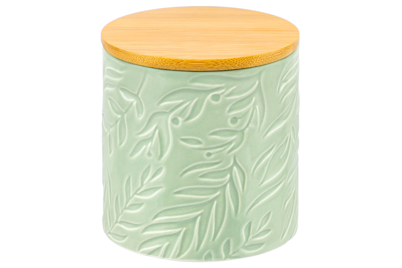 Банка от Elan Gallery предназначена для организации хранения продуктов на вашей кухне. Размер ёмкости – 10х10х11 см, объём – 430 мл. Выполнена из керамики и имеет светло-зелёный цвет, поверхность украшена рельефным лиственным узором. Крышка выполнена из натурального бамбука и оснащена силиконовым уплотнителем. Изделие отлично подойдёт для хранения сыпучих продуктов: сахара и соли, чая и кофе, приправ и специй. Храните в баночке ягоды, орехи и сухофрукты. Заполните её любимыми сладостями: леденцами, конфетами или печеньем. Подайте к столу, чтобы идеально дополнить чайную сервировку! Герметичная деревянная крышечка защитит ваши продукты от попадания грязи и пыли. Коллекция из трёх баночек нежных природных цветов впишется в любой интерьер и позволит организовать хранение даже на открытых полках. Не рекомендуется применять абразивные моющие средства. Не подходит для использования в микроволновой печи. Без бамбуковой крышки подходит для посудомоечной машины. Бамбук нельзя замачивать! Поставляется в дизайнерской картонной коробке – благодаря ей вам не потребуется дополнительная подарочная упаковка. Это идеальный подарок для хозяйки, ценящей не только практичность, но и стиль. В ассортименте бренда Элан Галерея представлены банки для хранения на любой вкус. Соберите целый набор кухонных контейнеров для эстетичного хранения продуктов на вашей кухне!