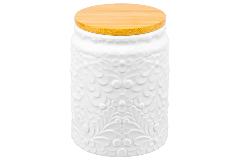 Банка от Elan Gallery предназначена для организации хранения продуктов на вашей кухне. Размер ёмкости – 9х9х12 см, объём – 450 мл. Выполнена из керамики и имеет белый цвет, матовая поверхность украшена рельефным лиственным орнаментом. Крышка выполнена из натурального бамбука и оснащена силиконовым уплотнителем. Изделие отлично подойдёт для хранения сыпучих продуктов: сахара и соли, чая и кофе, приправ и специй. Храните в баночке ягоды, орехи и сухофрукты. Заполните её любимыми сладостями: леденцами, конфетами или печеньем. Подайте к столу, чтобы идеально дополнить чайную сервировку! Герметичная деревянная крышечка защитит ваши продукты от попадания грязи и пыли. Коллекция из двух баночек лаконичных цветов впишется в любой интерьер и позволит организовать хранение даже на открытых полках. Не рекомендуется применять абразивные моющие средства. Не подходит для использования в микроволновой печи. Без бамбуковой крышки подходит для посудомоечной машины. Бамбук нельзя замачивать! Поставляется в дизайнерской картонной коробке – благодаря ей вам не потребуется дополнительная подарочная упаковка. Это идеальный подарок для хозяйки, ценящей не только практичность, но и стиль. В ассортименте бренда Элан Галерея представлены банки для хранения на любой вкус. Соберите целый набор кухонных контейнеров для эстетичного хранения продуктов на вашей кухне!