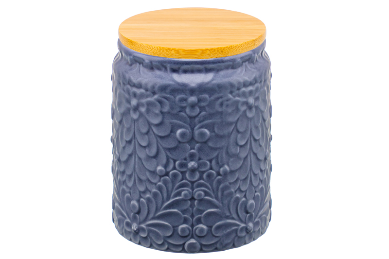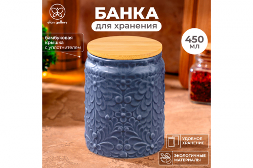 Банка от Elan Gallery предназначена для организации хранения продуктов на вашей кухне. Размер ёмкости – 9х9х12 см, объём – 450 мл. Выполнена из керамики и имеет серо-синий цвет, матовая поверхность украшена рельефным лиственным орнаментом. Крышка выполнена из натурального бамбука и оснащена силиконовым уплотнителем. Изделие отлично подойдёт для хранения сыпучих продуктов: сахара и соли, чая и кофе, приправ и специй. Храните в баночке ягоды, орехи и сухофрукты. Заполните её любимыми сладостями: леденцами, конфетами или печеньем. Подайте к столу, чтобы идеально дополнить чайную сервировку! Герметичная деревянная крышечка защитит ваши продукты от попадания грязи и пыли. Коллекция из двух баночек лаконичных цветов впишется в любой интерьер и позволит организовать хранение даже на открытых полках. Не рекомендуется применять абразивные моющие средства. Не подходит для использования в микроволновой печи. Без бамбуковой крышки подходит для посудомоечной машины. Бамбук нельзя замачивать! Поставляется в дизайнерской картонной коробке – благодаря ей вам не потребуется дополнительная подарочная упаковка. Это идеальный подарок для хозяйки, ценящей не только практичность, но и стиль. В ассортименте бренда Элан Галерея представлены банки для хранения на любой вкус. Соберите целый набор кухонных контейнеров для эстетичного хранения продуктов на вашей кухне!